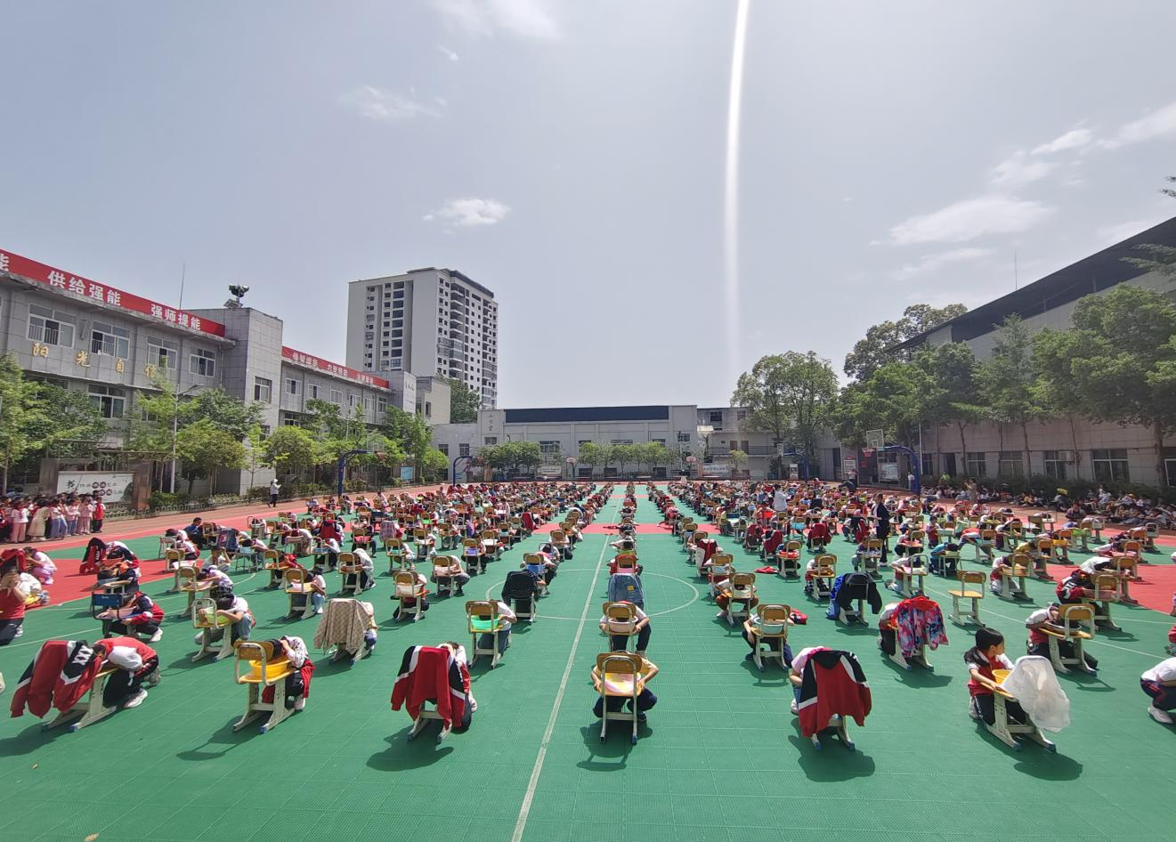 活动现场,孩子们精神抖擞,身着整齐的校服,鲜艳的红领巾在胸前飘扬。在集合整队环节,4 - 6年级学生迅速在篮球场正中摆放好凳子,盛满清水,以每班3列的方阵整齐站立;1 - 3年级学生则在4 - 6年级方阵两边及前方列成方阵,现场秩序井然。