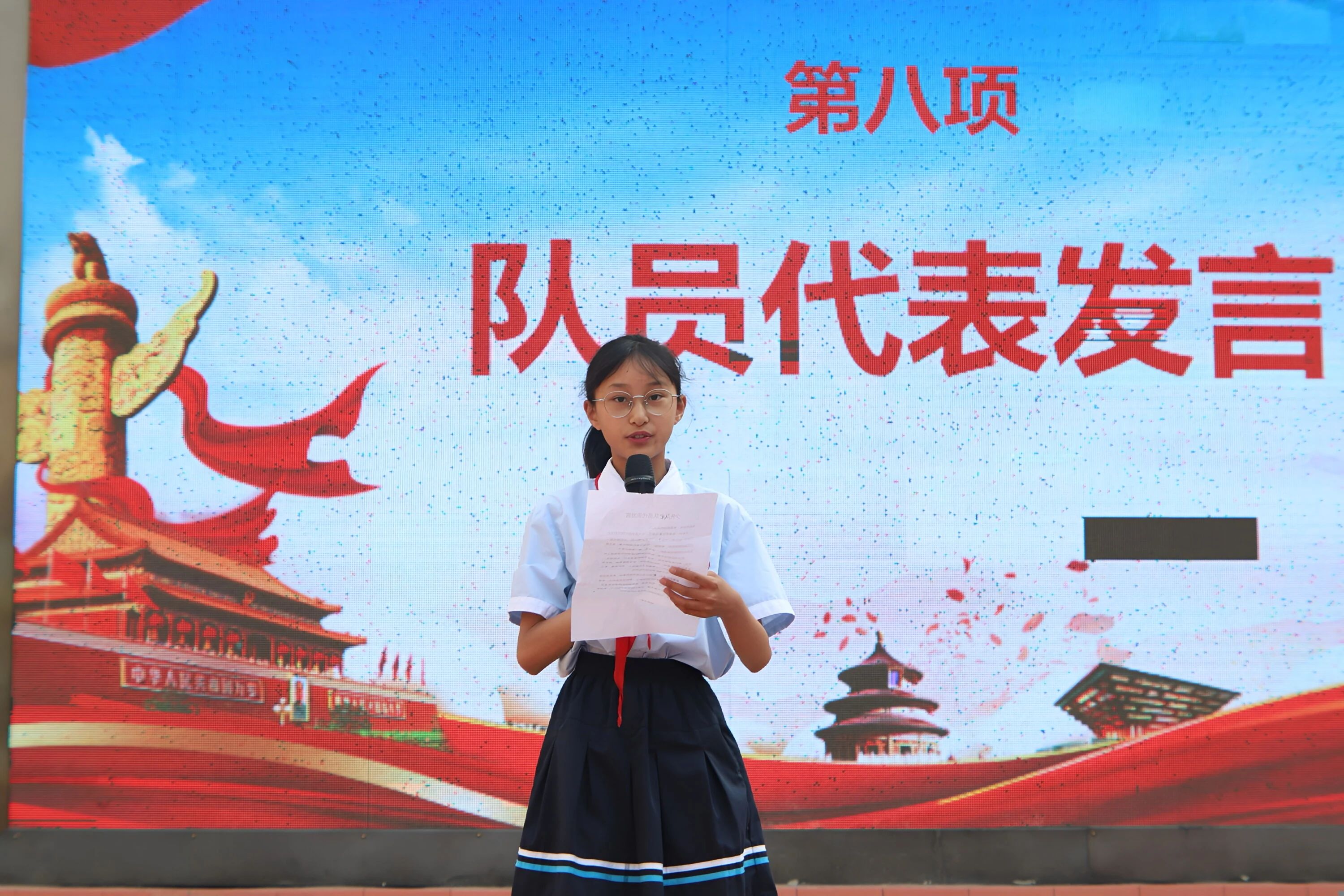 老队员代表马紫兰分享自己在少先队组织中的成长经历和收获,鼓励新队员们努力学习,积极进取,做一名优秀的少先队员。新队员代表董思妍同学用稚嫩而坚定的声音表达自己成为一名少先队员的激动心情和努力方向,表示将以实际行动为红领巾增光添彩。大队辅导员梁晴老师带领全体队员呼号:“准备着,为共产主义事业而奋斗!”——“时刻准备着!”那响亮的呼号声,如同春雷般震撼人心,响彻整个校园。
