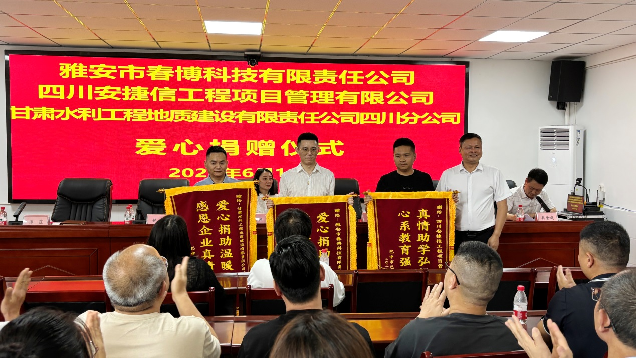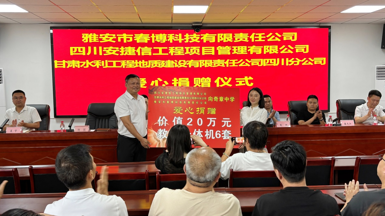 6 月 11 日上午,巴州区奇章中学大会议室里洋溢着温暖与感动,雅安市春博科技有限责任公司总经理钟迎春、甘肃水利工程地质建设有限责任公司四川分公司总经理李刚、福建省福州市珩一家居经理钟攀、四川安捷信工程项目管理有限公司经理潘文江,代表四家企业走进巴州区奇章中学,向学校捐赠价值20万元的教学一体机设备,以实际行动践行企业社会责任,传递企业对教育的关怀。