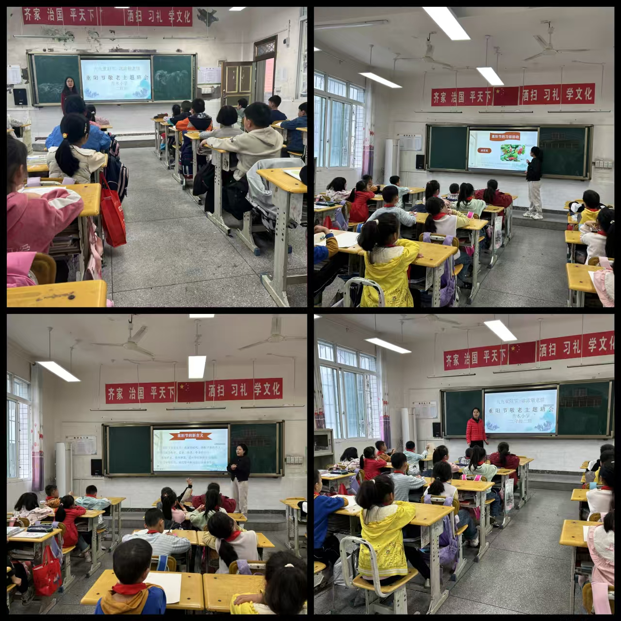 与此同时,各班级以“九九重阳节,浓浓敬老情”为主题开展了生动的班队活动。课堂上,班主任通过图文、视频等形式,带领同学们追溯重阳节的起源——从古代的“登高避灾”习俗,到如今成为“敬老节”的文化演变;通过讲解“赏菊、插茱萸、饮菊花酒、吃重阳糕”等传统习俗,让同学们直观感受节日魅力;此外,师生还共同诵读了“独在异乡为异客,每逢佳节倍思亲”“遥知兄弟登高处,遍插茱萸少一人”等经典诗句,在诗词中品味重阳节的文化内涵,加深对传统节日的认知与热爱。