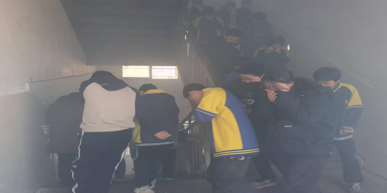 当天上午,随着警报声响起,演练正式拉开帷幕。各班教师迅速引导学生用湿毛巾捂住口鼻,弯腰低姿,沿预定路线快速有序撤离,从教室到操场安全区域,整个疏散过程紧张有序、衔接顺畅,全校师生均在规定时间内完成集结。