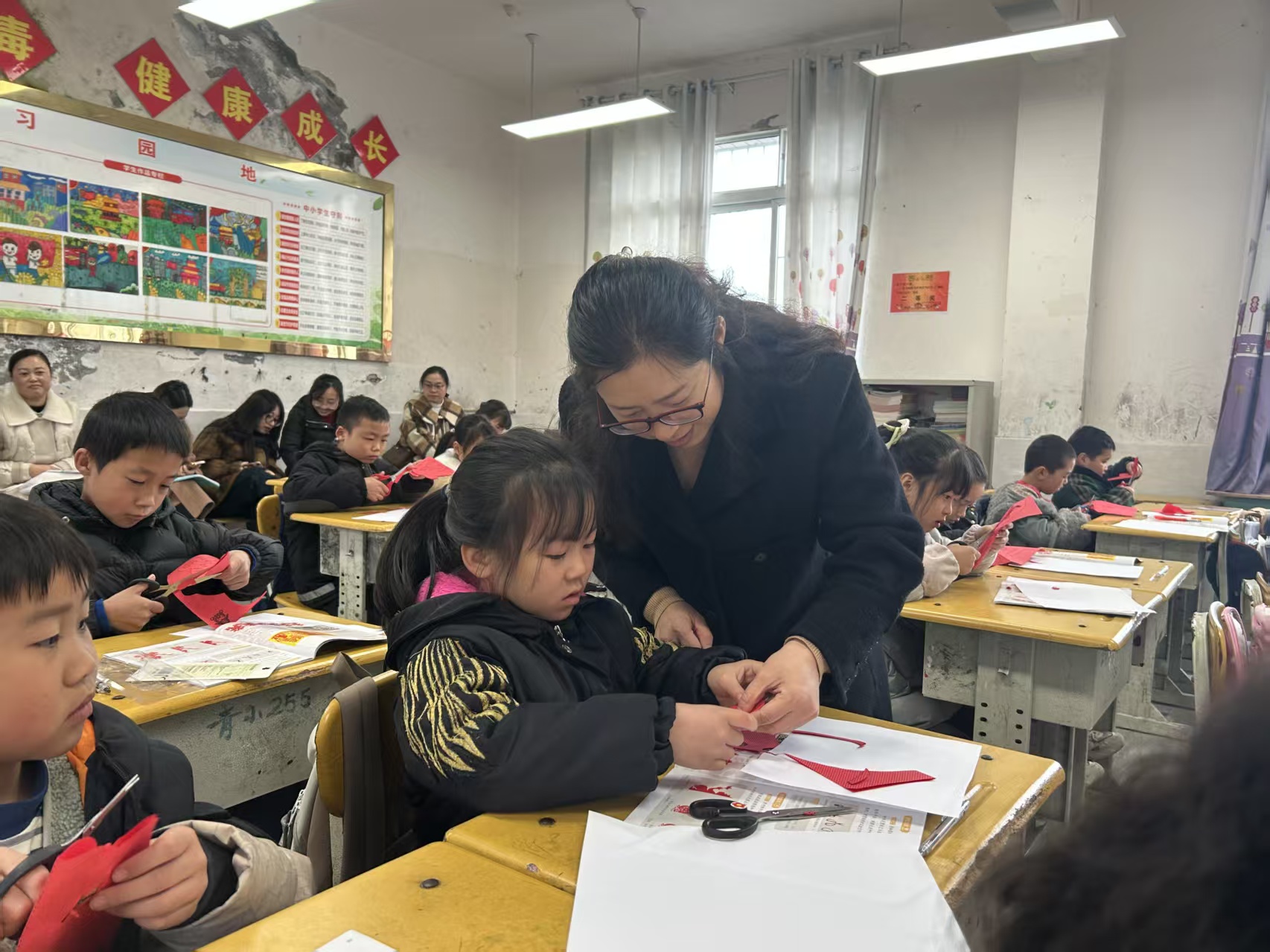 活动伊始,三节精心设计的美术示范课依次精彩呈现。邓伟老师执教的《剪出的风采》一课,以春节窗花创设情境,巧妙激发学生学习兴趣,自然引出剪纸主题。教学中,她通过清晰的步骤示范与微课视频,细致讲解了“对折—画稿—剪刻—展开”的剪纸制作流程。学生们在邓老师的引导下积极动手实践,不仅掌握了剪纸的基本技法,成功创作出一幅幅对称整齐、充满童趣的剪纸作品,而且还在创作过程中深刻感受到民间剪纸艺术与生活、民俗的紧密联系,增强了对传统文化的认同与热爱。