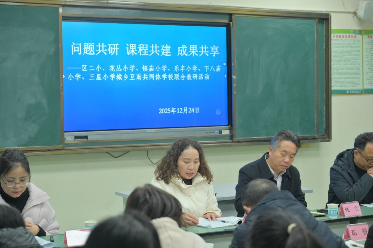 12月24日,区二小、花丛小学、乐丰小学、镇庙小学、三星小学、下八庙小学共同举办城乡校际教学研讨活动,六所学校校长、分管教学副校长、教研组长及骨干教师代表齐聚一堂,围绕“共建·共研·共享”主题,展开深度交流与协作。