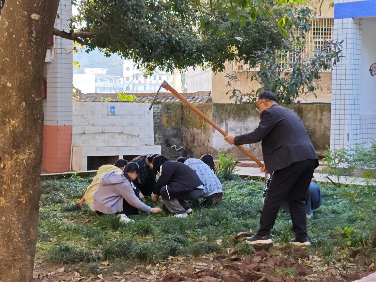 活动现场,全校师生热情高涨、积极参与,在校园指定空地分工协作、有序开展植树工作。大家有的手持铁锹认真挖坑,有的小心翼翼扶稳树苗扶正,有的俯身填土压实,还有的提着水桶仔细浇水,个个干劲十足、配合默契,现场一派热火朝天的景象。