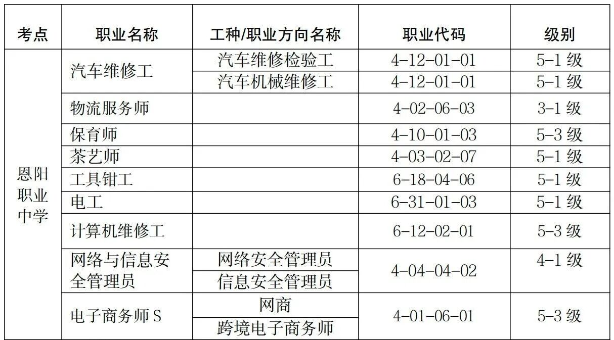 作为市人社局批准的第三方考点,学校目前可开展包括汽车维修工、物流服务师、保育师、茶艺师、工具钳工、电工、计算机维修工、网络与信息安全管理员、电子商务师在内的9个工种(5至1级)技能等级认定。