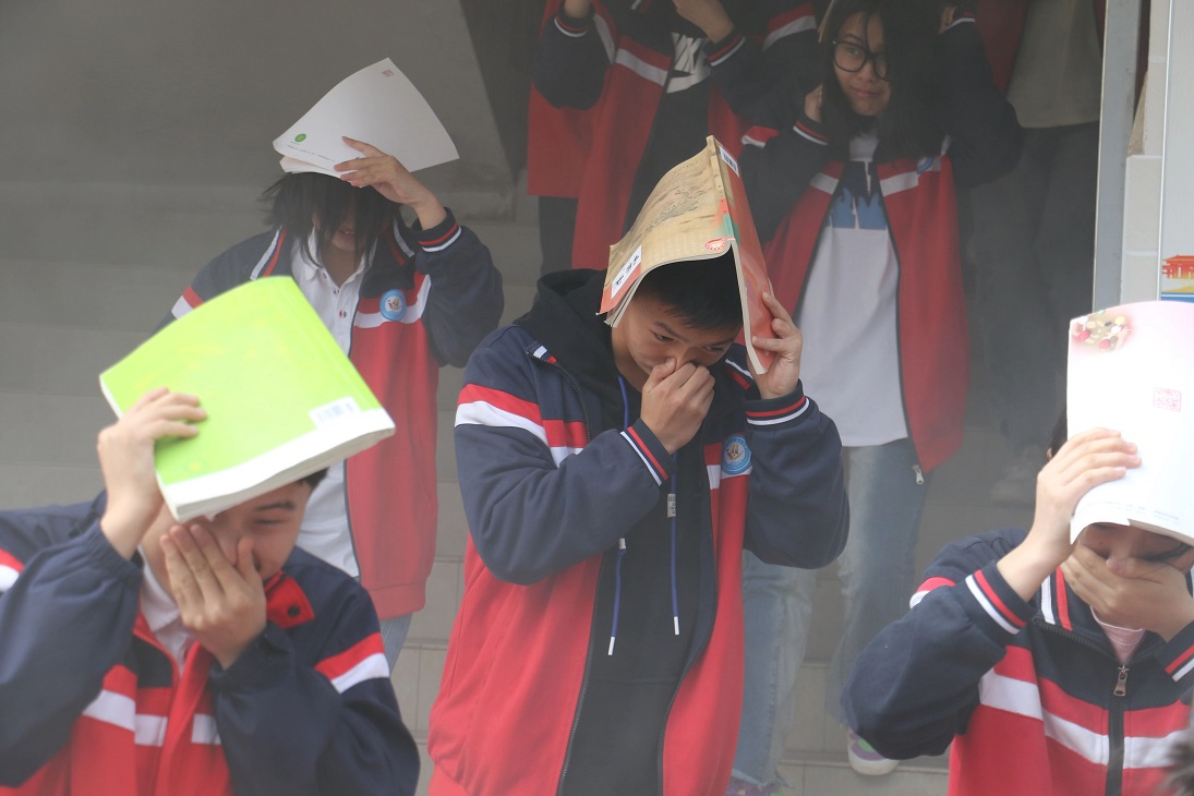 随着烟雾四散,发现火情后立即启动消防应急预案,任课老师、班主任开始疏散学生。疏散人员用湿毛巾捂住口鼻,保持低姿势,在各应急小组成员的带领下快速撤离教室,用最合理、最快速的方法逃离火场,疏散至室外安全区域,并清点人数。
