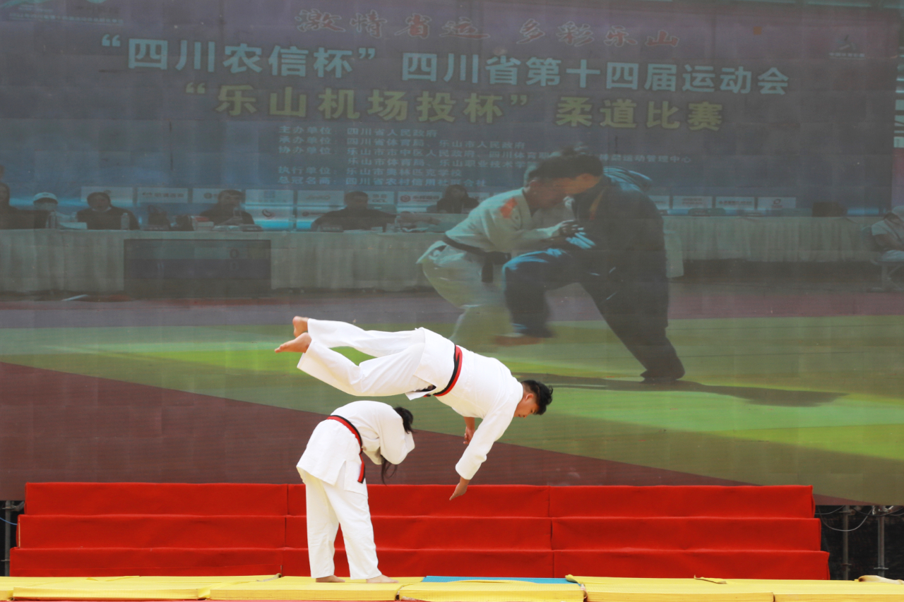 举摔柔训练中心队员震撼亮相,配合扑脚、别子、倒口袋、过肩摔等技巧演练,引得台下频频欢呼喝彩!