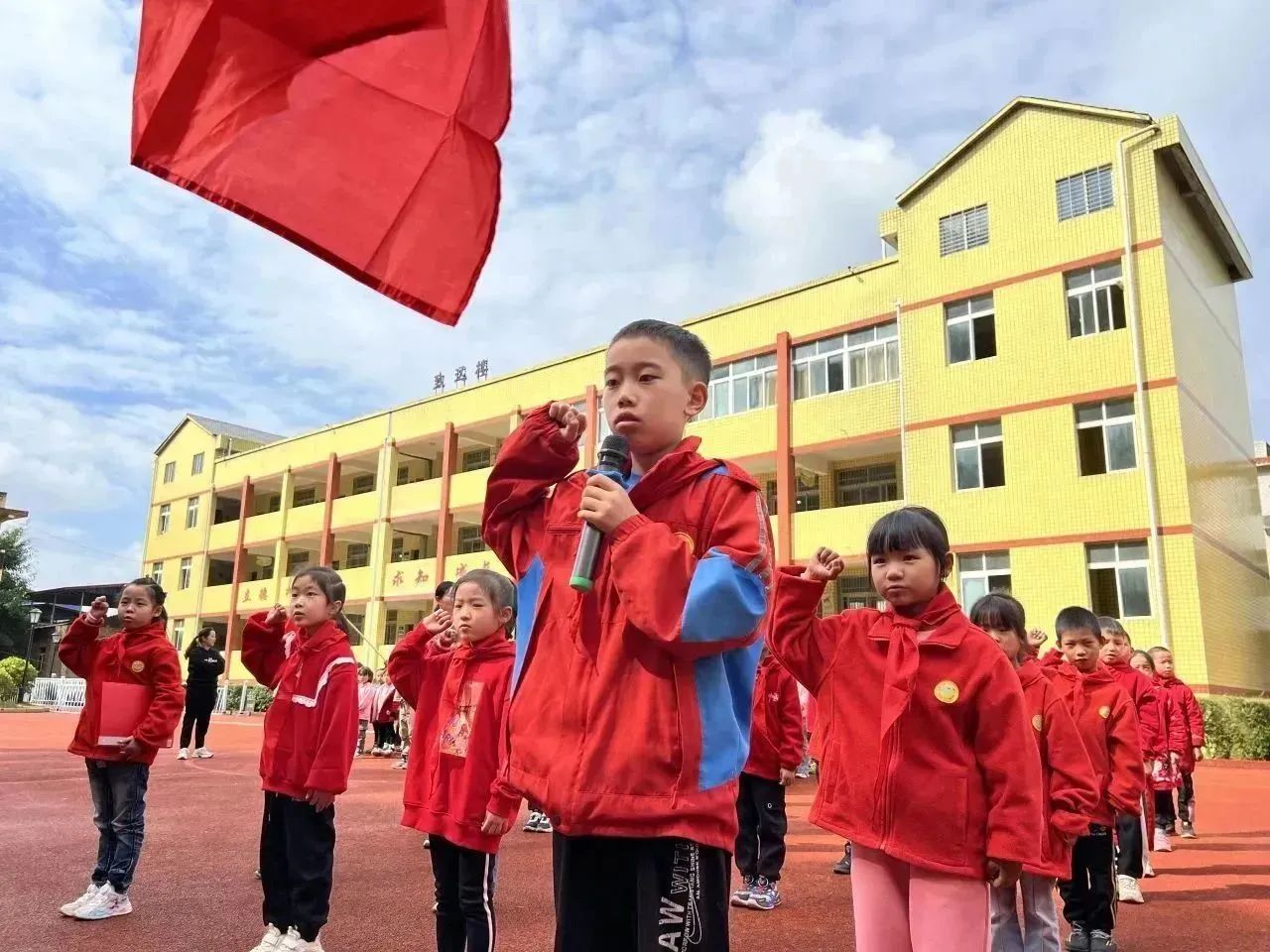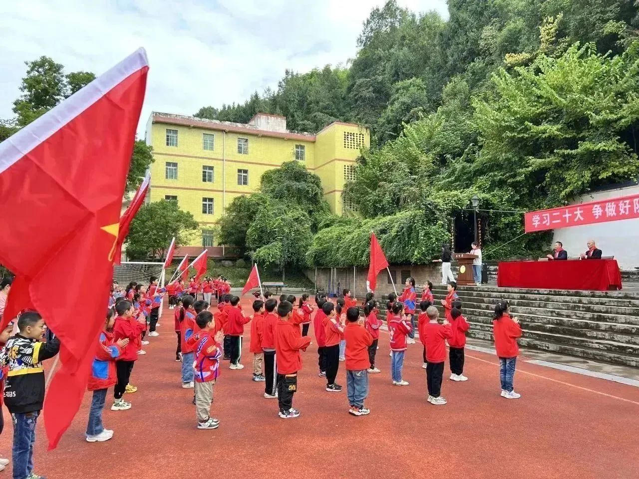 伴随着庄严的出旗曲,旗手们英姿飒爽,步伐铿锵,为入队仪式拉开了序幕。队员们齐唱队歌,嘹亮的歌声传递出少先队员热爱党、热爱祖国、热爱人民的情感。