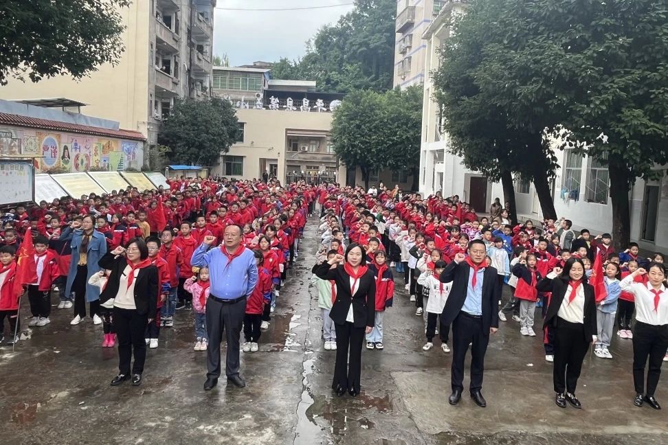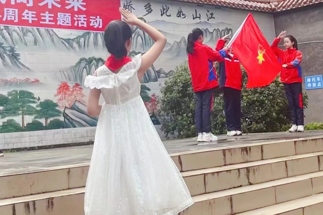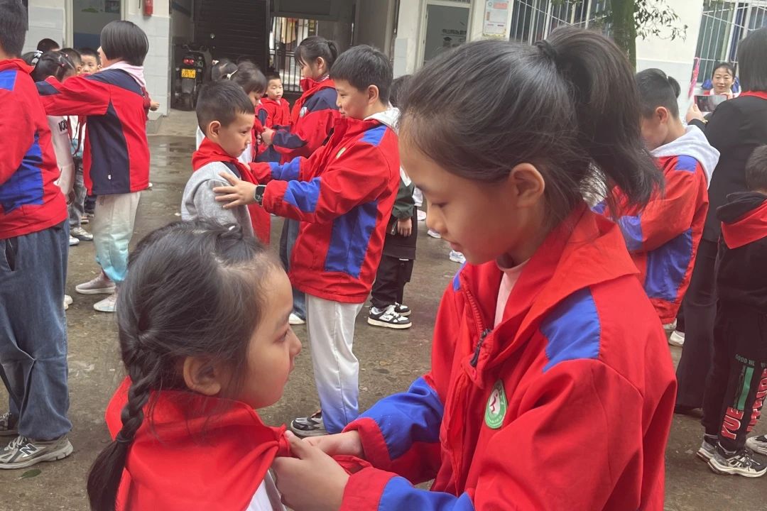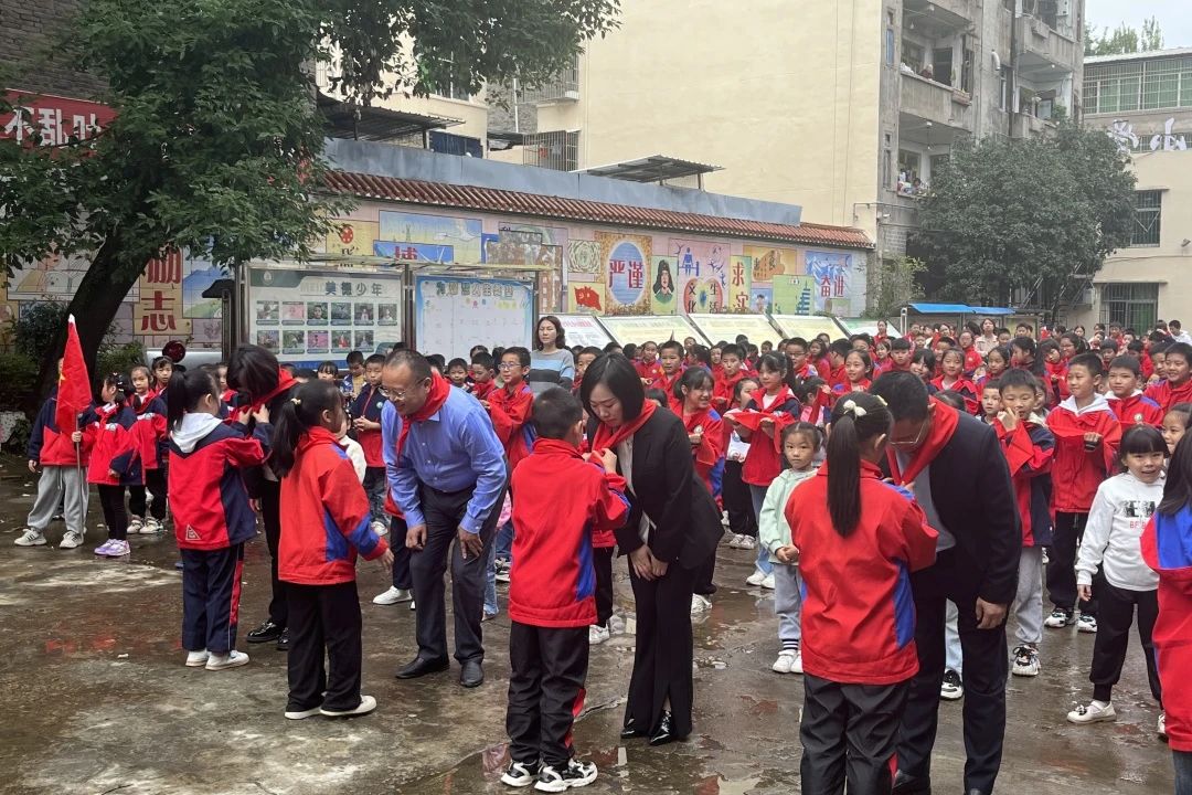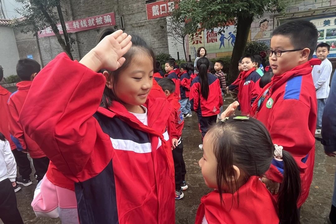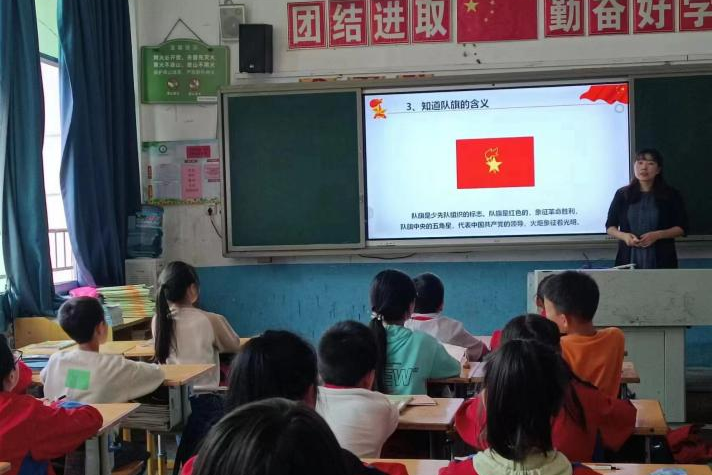 授红领巾。红领巾是标志,是继承,是骄傲;红领巾是名片,是使命,是奉献。伴随着激昂的《红领巾》音乐,五年级的哥哥姐姐们为新队员戴上鲜艳的红领巾。