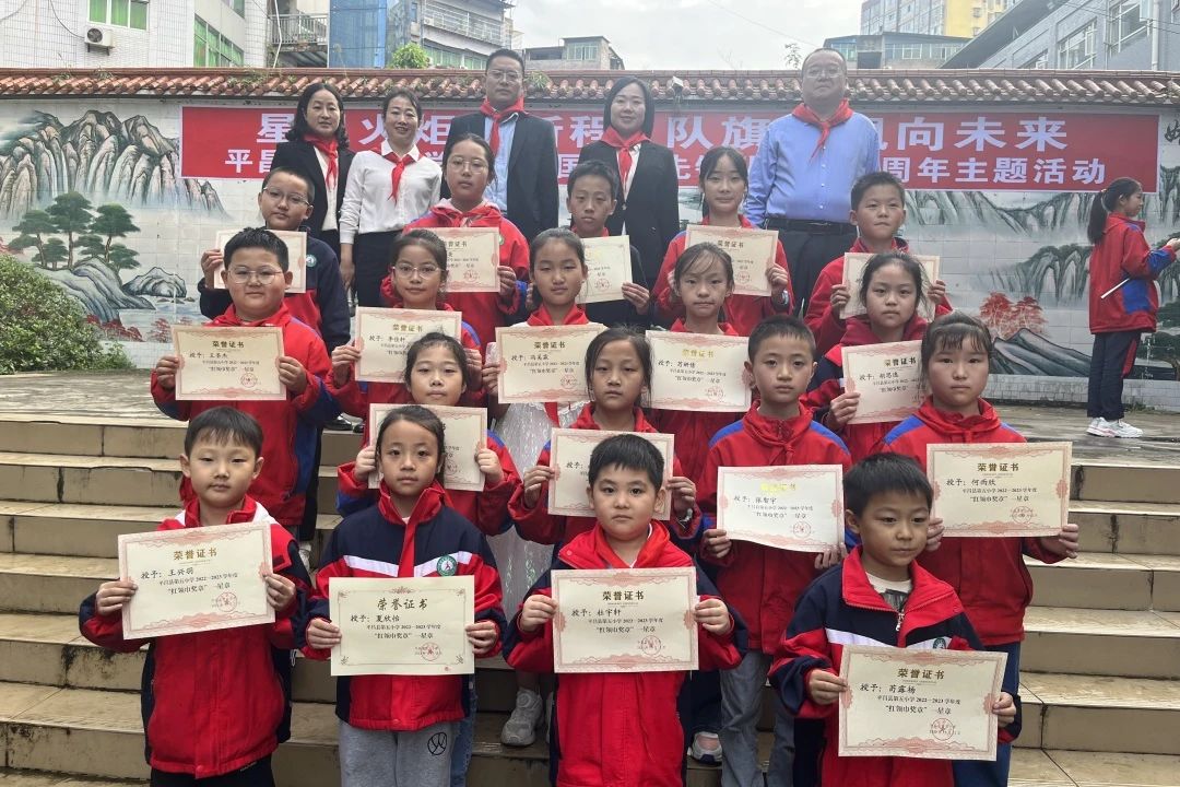 工会主席曹淋同志宣读获得2022——2023学年度“红领巾奖章”校级一星章少先队员表彰决定。学校领导为获奖同学颁奖,合影留念。