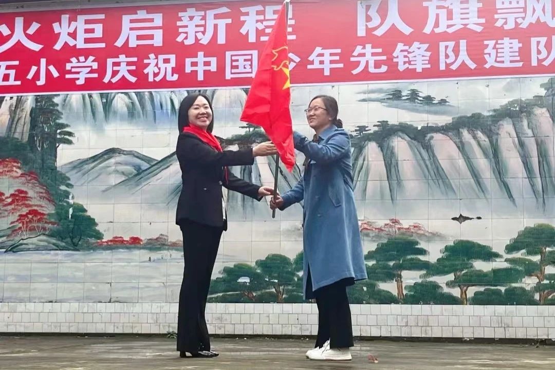 授中队旗。 党支部书记,校长,少工委主任郑明玲同志为新中队授旗。