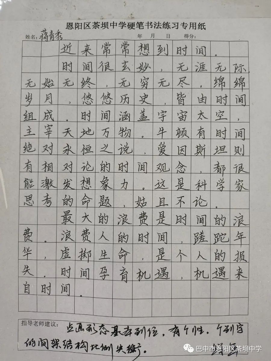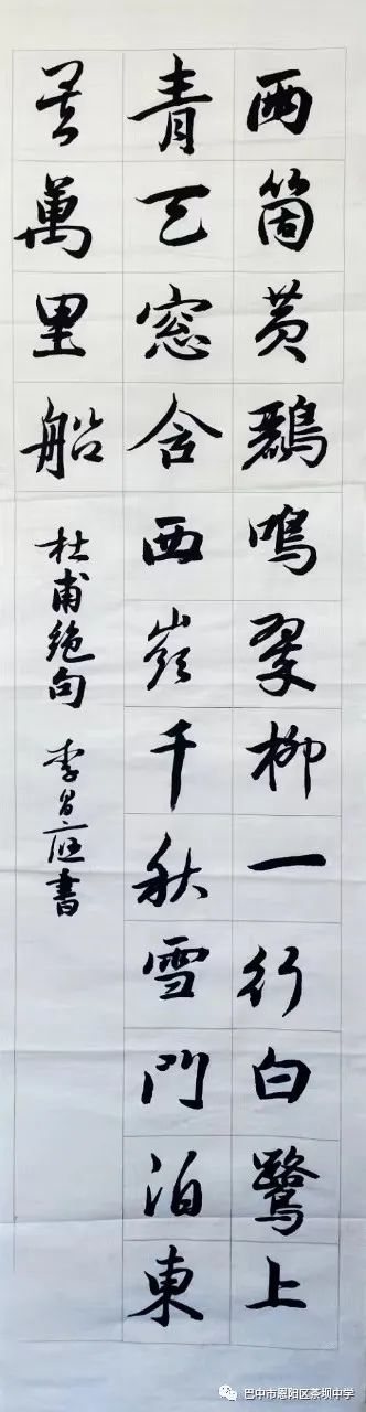 中国书法是无言的诗,无形的舞,无图的画,无声的乐。撇捺纵横间,书有尽而意无穷。中国书法不仅是中华民族独有的艺术瑰宝,它更是中国精神的外化图腾。无论是“挥毫散林鹊,研墨惊池鱼”,还是“兴来洒素壁,挥笔如流星”。可以说,中国书法在腾挪方寸之间,无不在表达着东方的审美与哲学。那今天就让我们走进恩阳区茶坝中学书法课程,欣赏孩子们的作品,共同品读中华精气神。