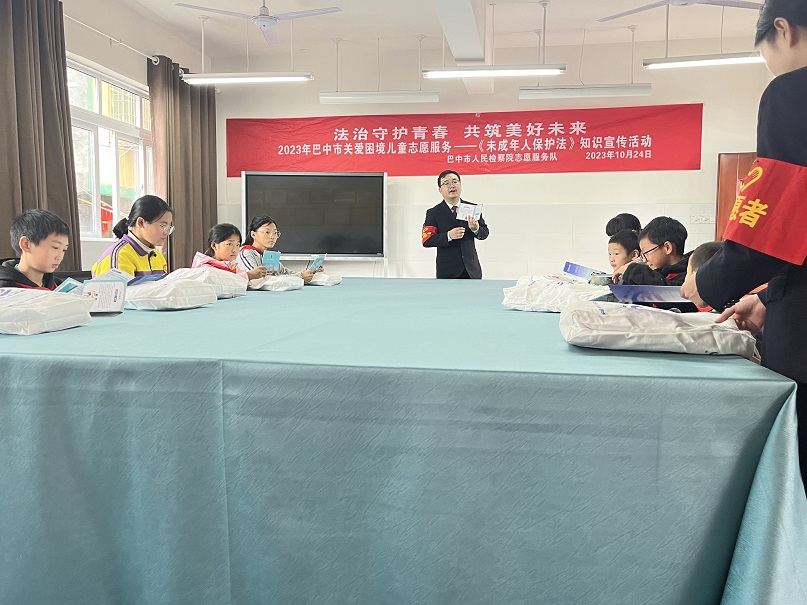 春润万物,法润学子。为加强学校法治建设,提高未成年人的自我保护意识,守护少年儿童健康成长,2023年10月24日,巴中市人民检察院志愿服务队及平梁镇民政办一行带着“法治大礼包”走进青山小学,开展以“法治守护青春 共筑美好未来”为主题的关爱困境儿童志愿服务活动。