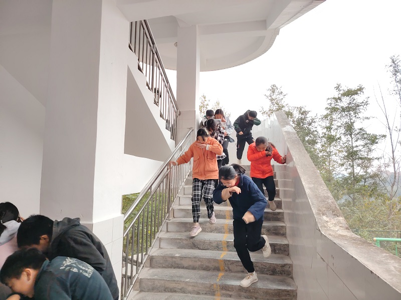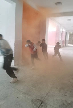 上午10:20分,随着防空警报拉响,模拟火场浓烟滚滚。各班同学从教室前后迅速撤离,捂住口鼻,沿着逃生通道弯腰通过火场,迅速撤离至安全区域。到达安全区域后,各班级迅速清点完人数并报告总指挥。