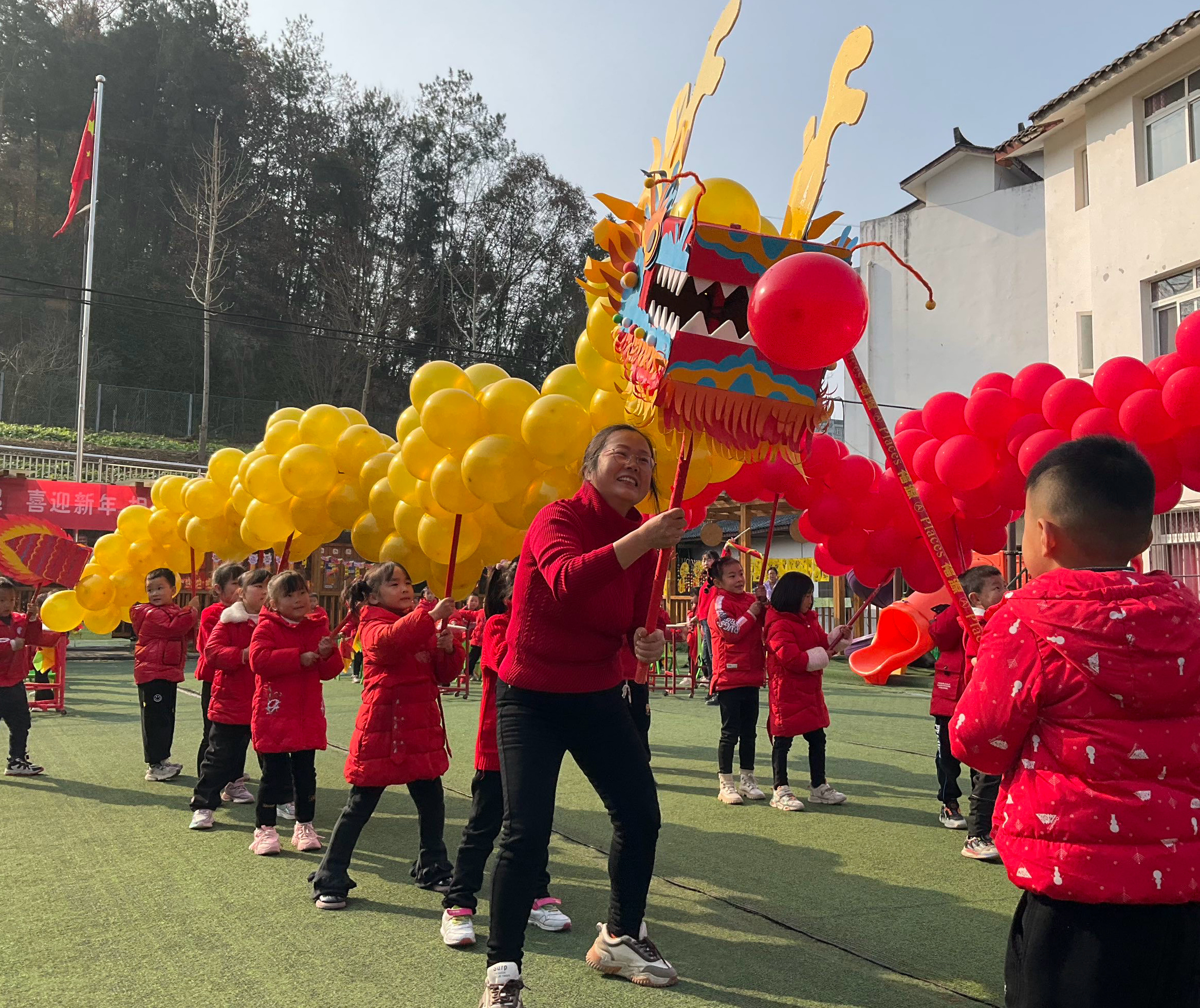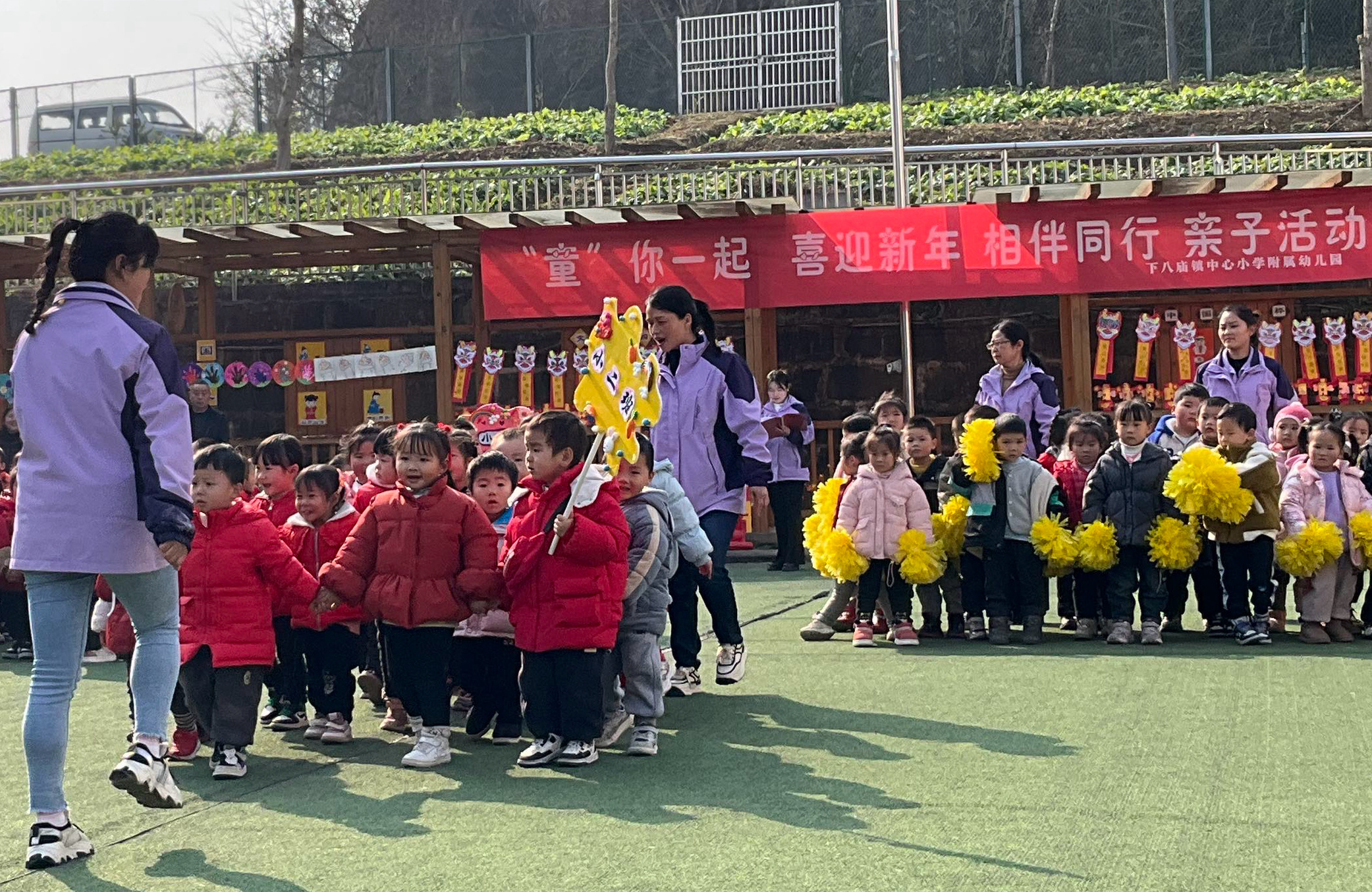 家委会成员和幼儿园教职工忙碌而有序地准备。走廊上张灯结彩,处处都是孩子们极富想象力的新年创作。大家一起感受着这浓浓的新年氛围。