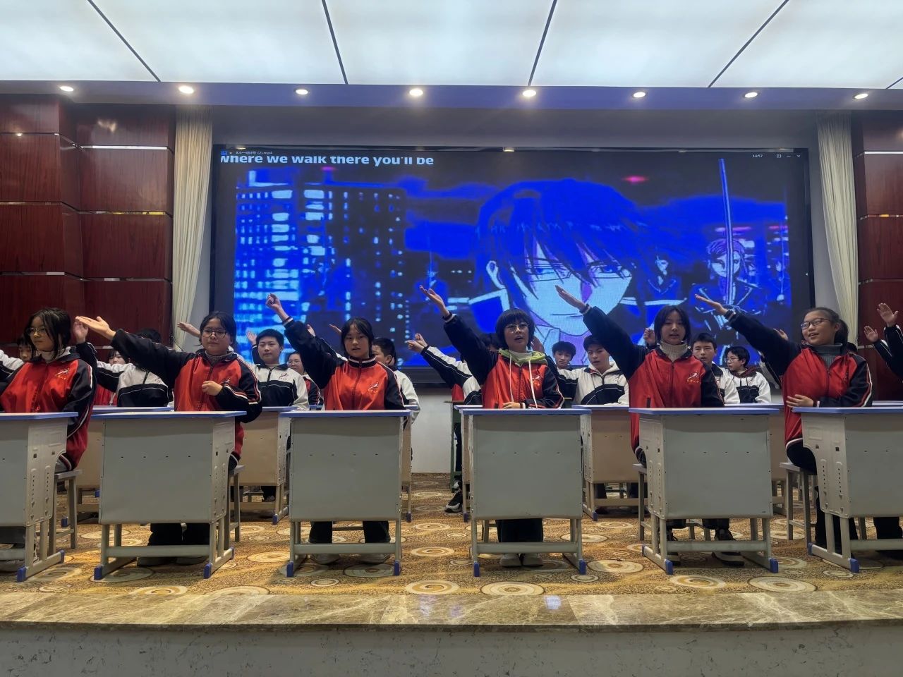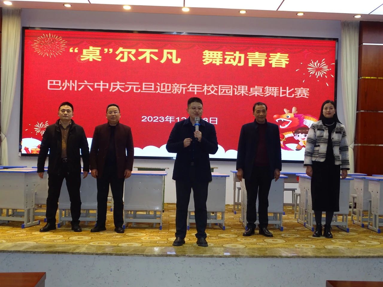 点燃学习激情,舞动快乐青春。为全面贯彻党的教育方针,落实立德树人根本任务和"双减"政策,进一步丰富学生的课间生活,提高学生的艺术素养和审美能力,营造积极向上的校园文化氛围。2023年12月28日下午,巴州区第六中学初二年级全体师生、学生家长代表在致公四楼大会议室欢聚一堂,举行期待已久的“‘桌’尔不凡 舞动青春”庆元旦迎新年校园课桌舞比赛。