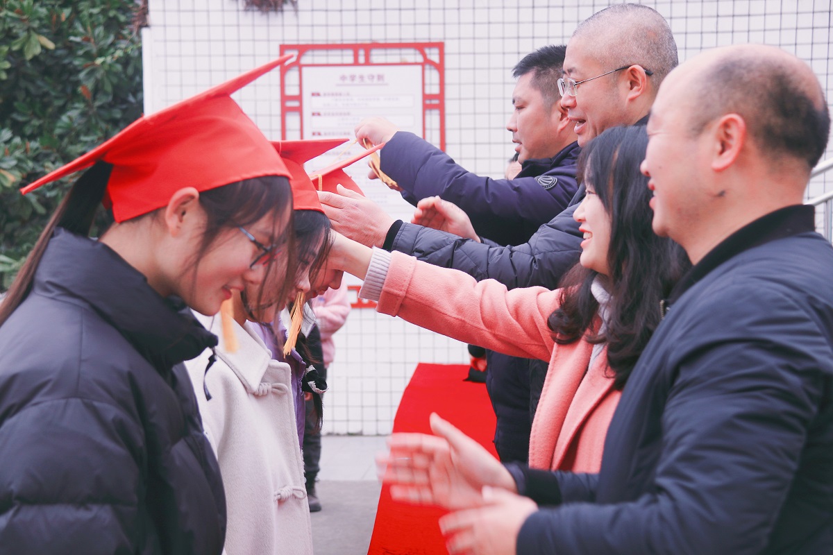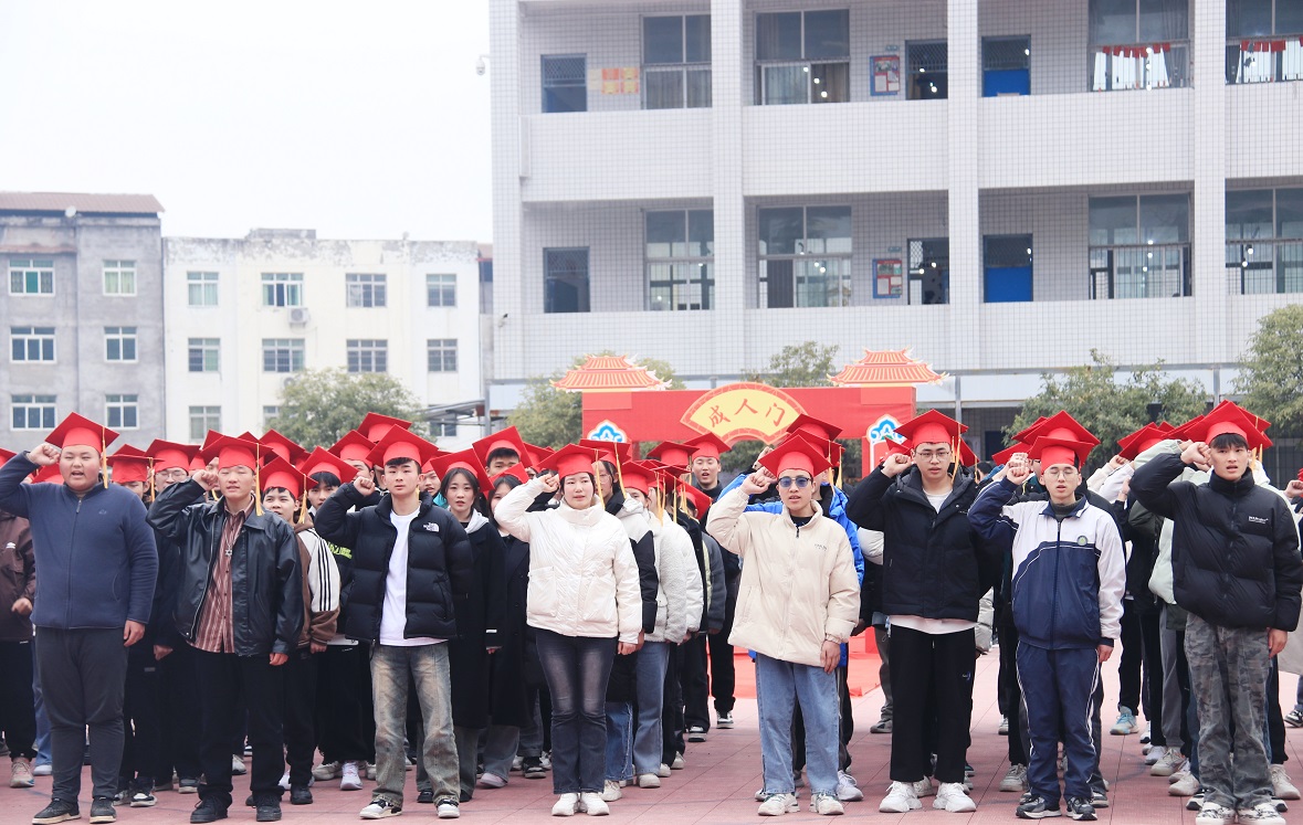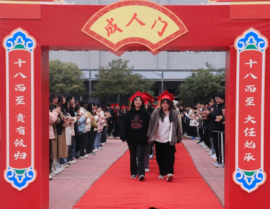 高三学子在学弟学妹们的掌声与欢呼中迈过成人门,老师们为学子拨穗正冠。学子们齐声宣誓“鼎天立地,志存高远,勤劳坚毅,自强不息”。