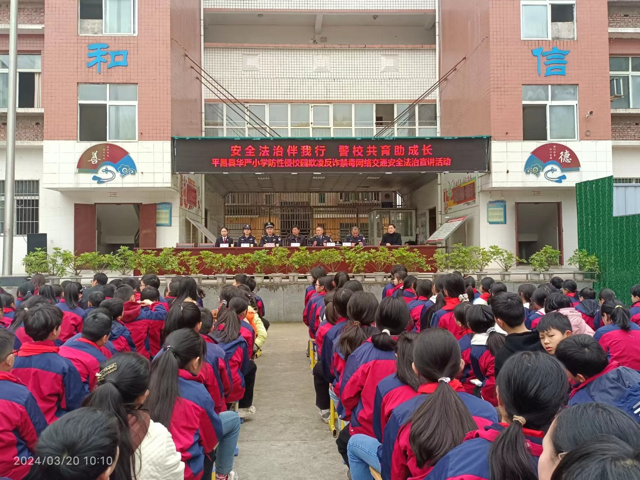 深化未成人法治教育,切实提高未成年人的自我保护意识和安全防范能力,护航未成年人健康成长。3月20日上午,平昌县华严小学邀请了平昌县“关爱明天 普法先行”法治宣讲团部分成员到校开展了“安全法治伴我行 警校共育助成长”法治宣讲活动。活动由学校法治副校长吴斌主持,全校师生参加了此次活动。