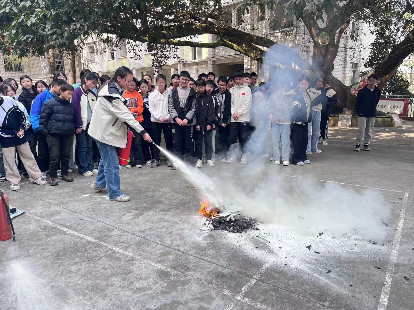 演练结束,对生活老师、食堂从业人员、师生进行了灭火器使用的培训并现场进行了演练。