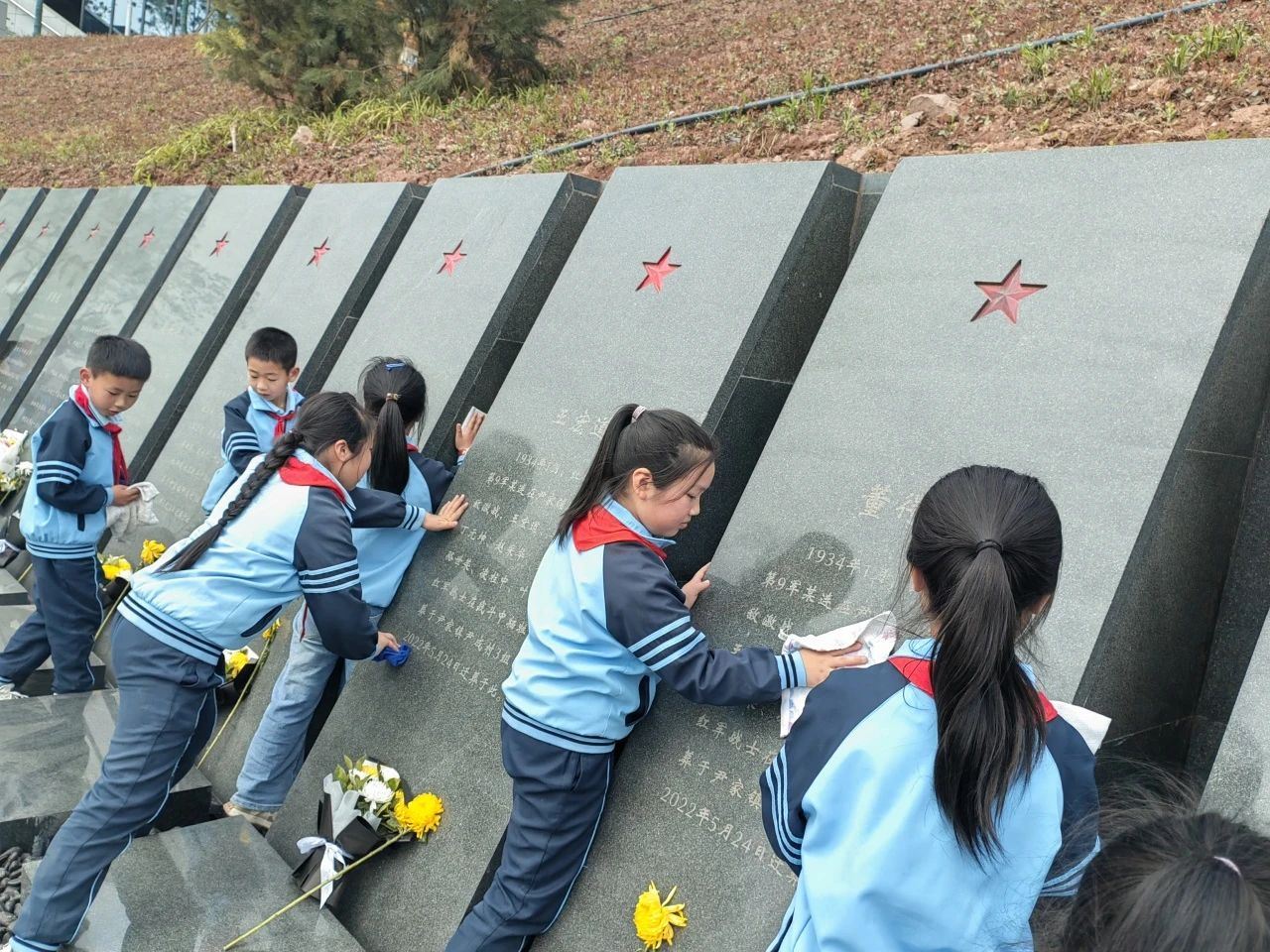 全体师生绕着烈士陵墓一周,敬献手中的鲜花。一朵朵洁白的花朵,象征着先辈心灵的纯洁无暇,象征着先辈崇高的品质和无私的精神。