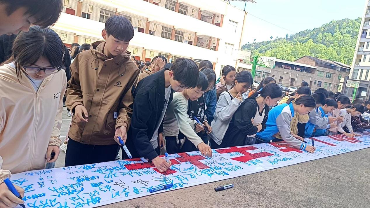 在宣誓签名活动中,全体学生用响亮的声音郑重地承诺必将严格遵守“七不两会”的防溺水要求,时刻注意自身安全;并在主题标语上签上自己的名字,表达了预防溺水的决心。