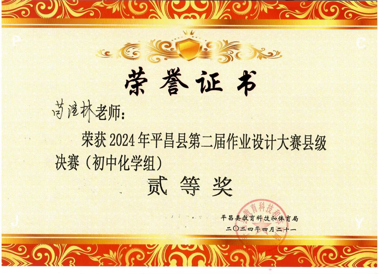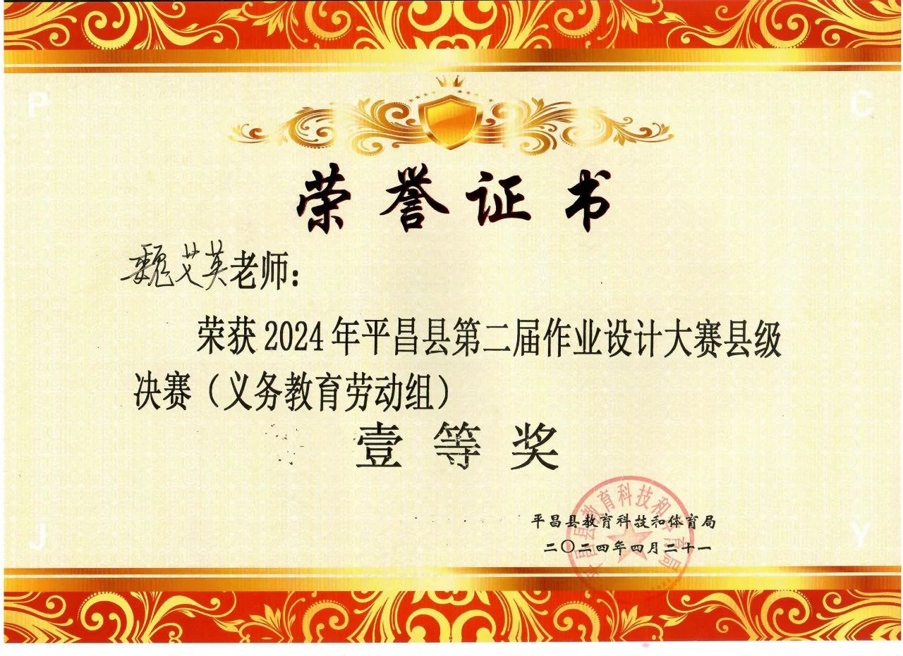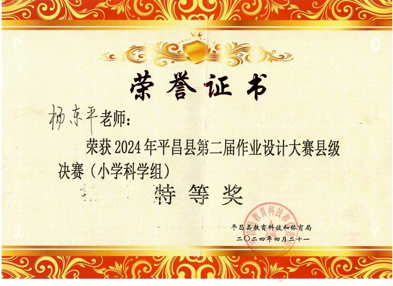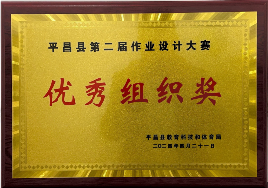 2024年平昌县第二届作业设计大赛中我校共有6名教师进入决赛,斩获特等奖1个、一等奖1个和二等奖4个,涵盖科学、劳动、数学、化学、物理、数学六个学科。学校荣获“优秀组织奖”,圆满完成了”以赛促学、以学促做“的任务目标。