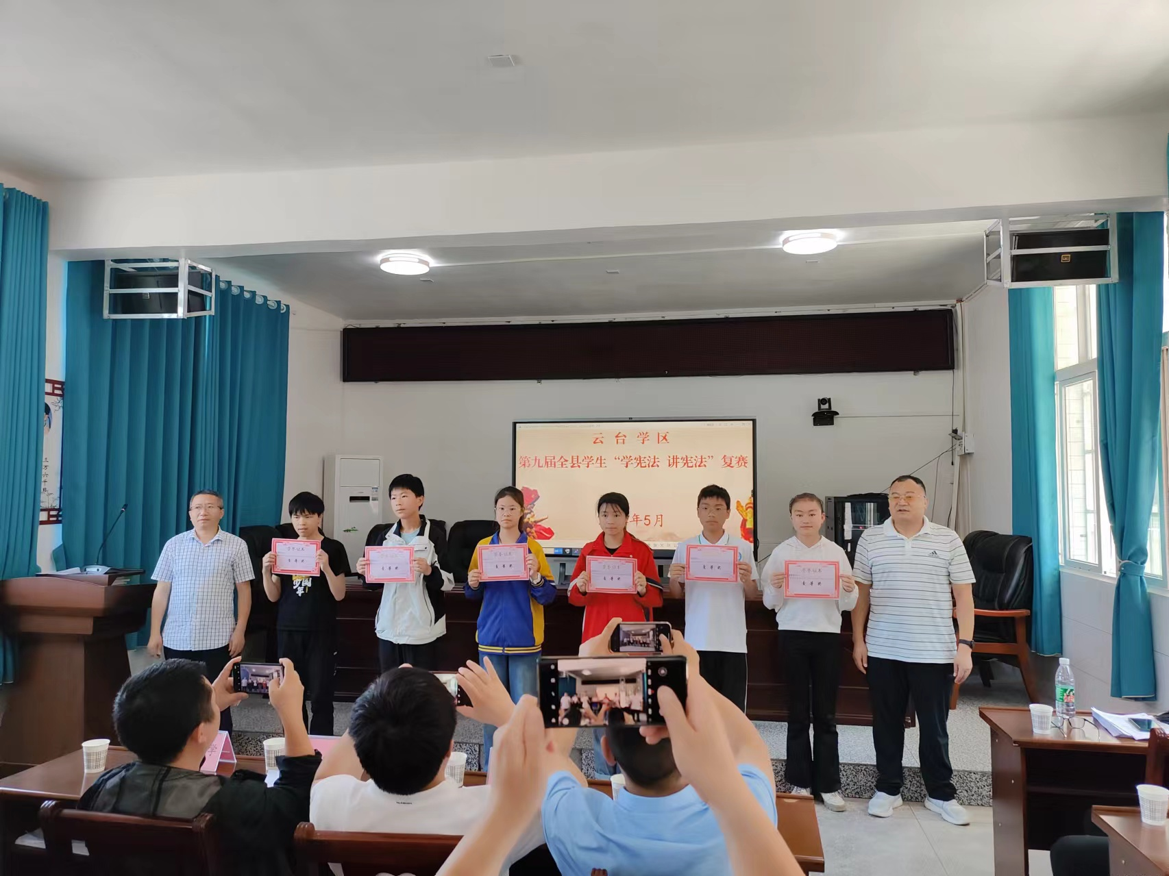 经过激烈紧张地角逐,来自板庙小学四年级的张潇艺和邱家镇初级中学八年级的陈梓瑞分别荣获小学组、初中组“学宪法 讲宪法”演讲赛复赛一等奖;来自邱家小学五年级的冯丽媛和鹿鸣小学七年级的张钊分别荣获小学组、初中组法治素养竞赛复赛一等奖,并代表云台学区赴县参加决赛。