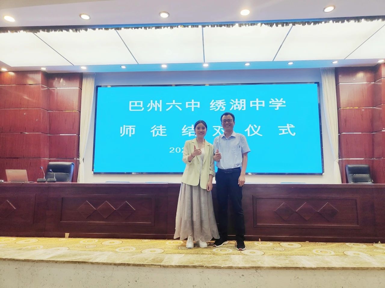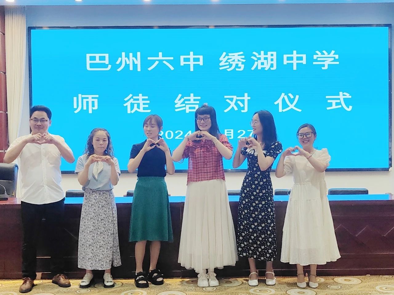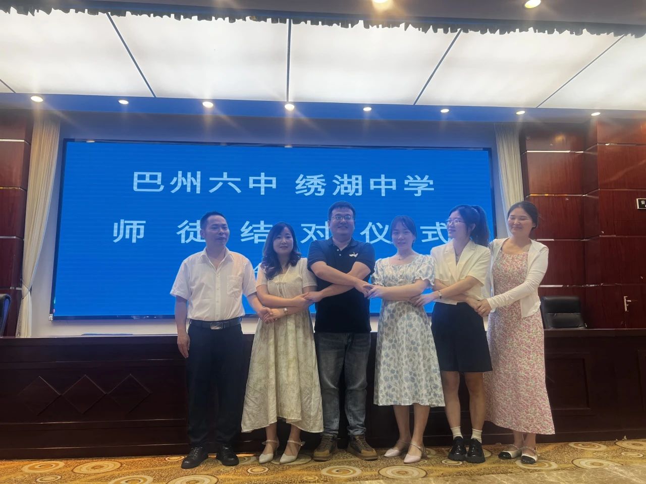 除了授牌活动外,还开展师徒结对活动。绣湖中学陈桦涧、骆峰云、严兰芳、黄晶等4名老师与巴州六中的徒弟们合影留念。
