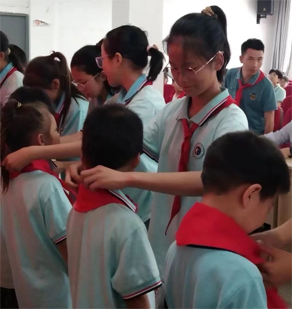 五一中队的老队员们给新队员们授戴红领巾。鲜艳的红领巾在胸前飘扬,载着我们的理想扬帆起航。