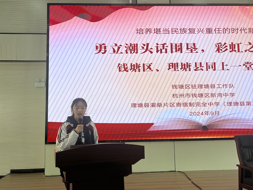 钱塘区新湾中学学生代表罗钰淋、理塘县濯桑片区寄宿制完全中学学生代表白玛卓玛先后代表两校学生发言。两位杰出学子共同表示,通过学习本次思政课,感到收获颇丰。讲者讲的精彩,听众听的认真。她们纷纷表示,要通过相互了解、相互尊重、相互欣赏、像石榴籽那样紧紧抱在一起。最后,双方相互发出了属于青春的互访邀请,希望理塘钱塘学子多走动、多往来、多交流、多联络、在新一代心中种下塘塘合作、共同奋进的种子。活动中,钱塘区新湾中学的学子为两地师生奉献了一曲《梦想天堂》。