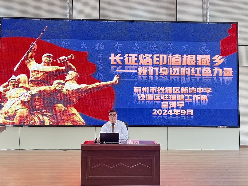 钱塘教育理塘对口支援工作组教师、钱塘区新湾中学历史学科教师吕涛宇在理塘分会场为两地师生带来《长征烙印植根藏乡——我们身边的红色力量》的专题思政课程。他从长征的历史背景讲起,深入浅出的介绍了红三十二军进驻甲洼镇,在此筹粮修整,召开中共西康南路工作会议,成立甲洼博巴红色政府的相关历史。吕涛宇老师通过详实的史料和精细的地图使广大听众认识到理塘县是一片浸润着光荣革命传统的红色土地,红军长征为“天空之城”播下了“红色的种子”。使听众深刻认识到:“没有共产党就没有新中国。”