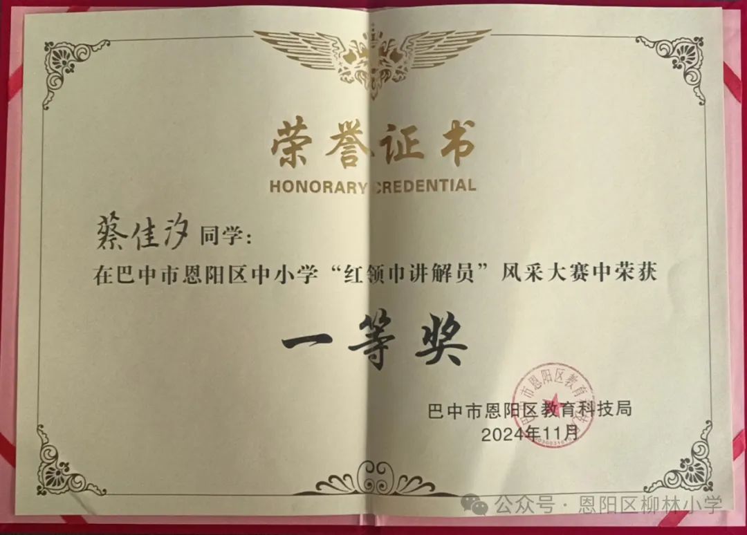 柳林小学参加“才涌恩阳·奔跑起航”2024年全区红色故事讲解员大赛喜获佳绩。我校优秀红领巾讲解员蔡佳汐获青少年组一等奖。
