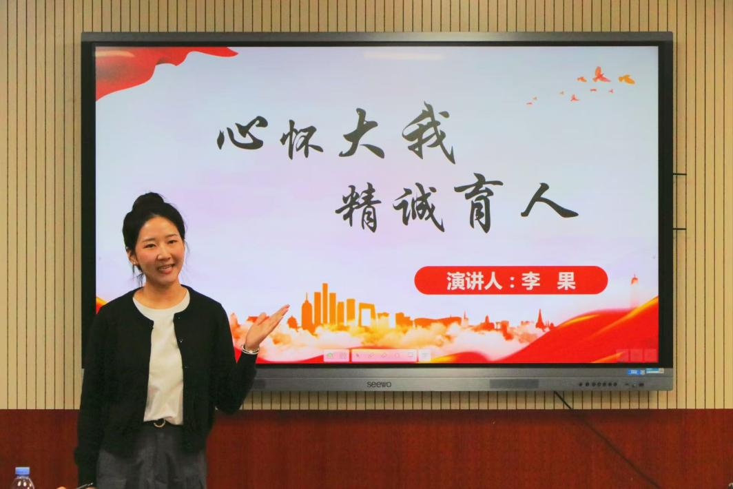 李果老师以《心怀大我,精诚育人》为题,讲述了身边的先进榜样事迹。她强调新时代的教师要以榜样为引领方向,做到心怀大我,将个人发展与育人使命紧密相连,将个人命运与爱国情怀深度融合,切实做到知行合一。在育人道路上,行己所爱,爱己所行,努力肩负起时代赋予的重任,在平凡岗位上缔造辉煌成就。