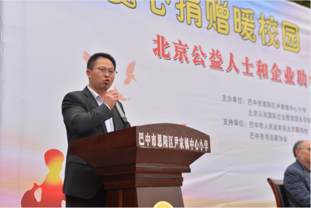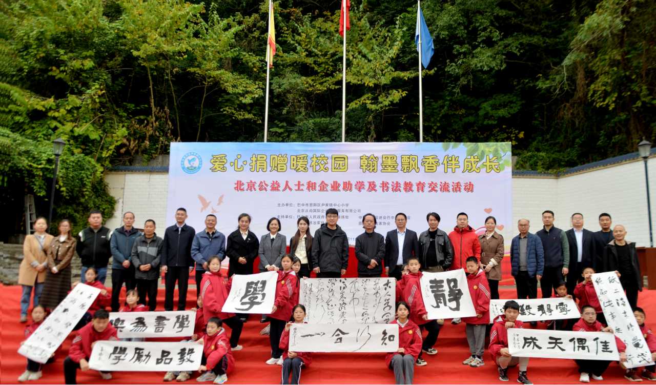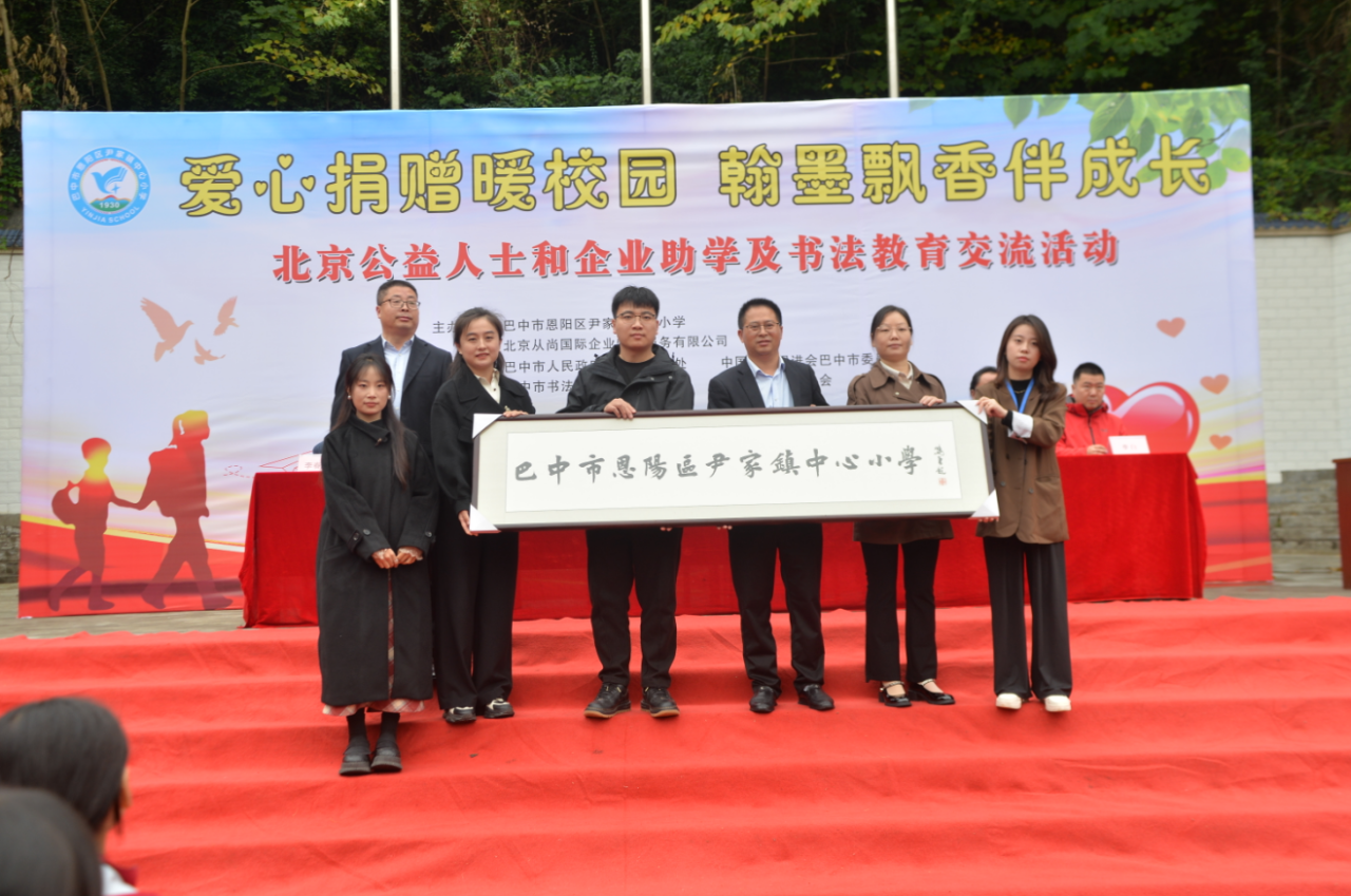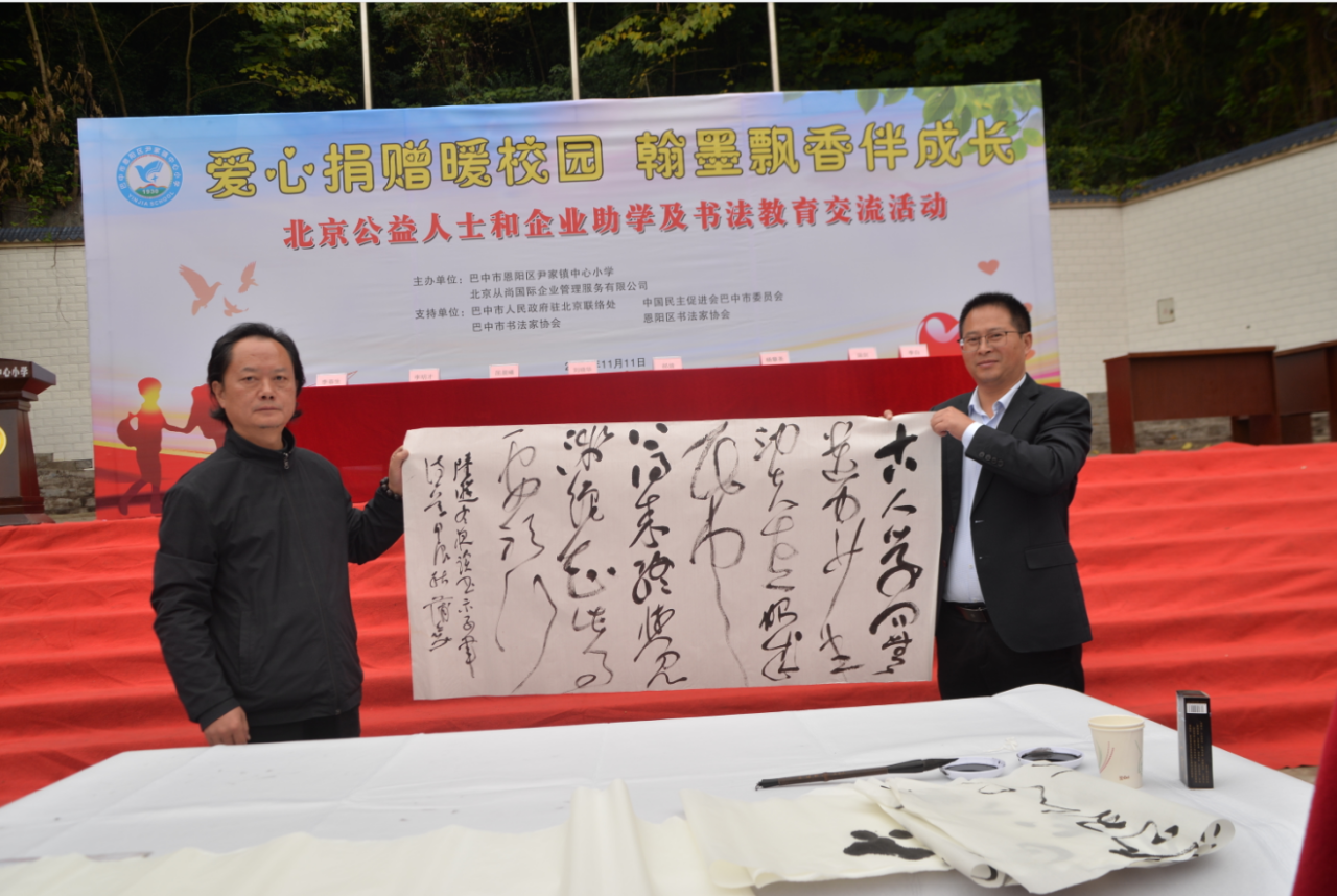 11月11日,“爱心捐赠暖校园,翰墨飘香伴成长”——北京公益人士和企业及书法教育交流活动在尹家小学举行。北京从尚国际企业管理服务有限公司党支部书记郝靖女士、部门经理黄嫱女士,北京师范大学艺术与传媒学院书法系教务员、博士生屈晨曦先生,民进巴中市委会副主委兼秘书长刘晓华女士,中国书法家协会会员、巴中市书法家协会常务副主席、秘书长蒲剑先生,中国教育学会书法教育专业委员会会员、巴中市恩阳区书法家协会主席李春生先生及尹家镇党委政府领导出席活动。