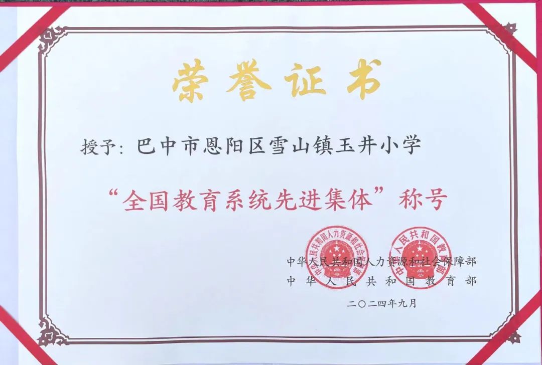 恩阳区雪山镇玉井小学校:获评“全国教育系统先进集体”荣誉称号