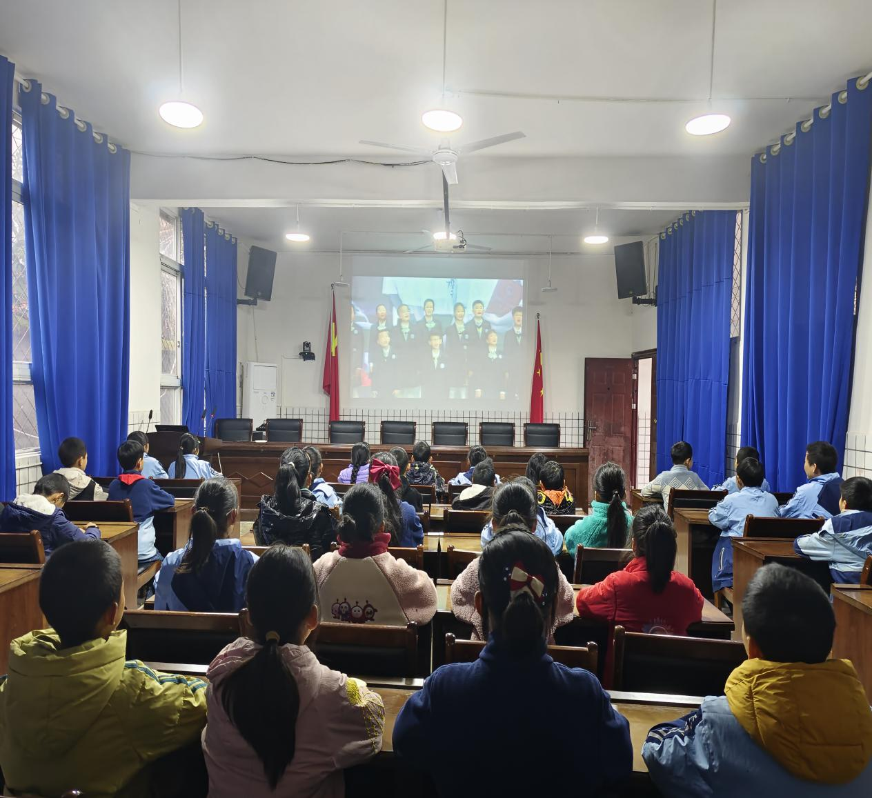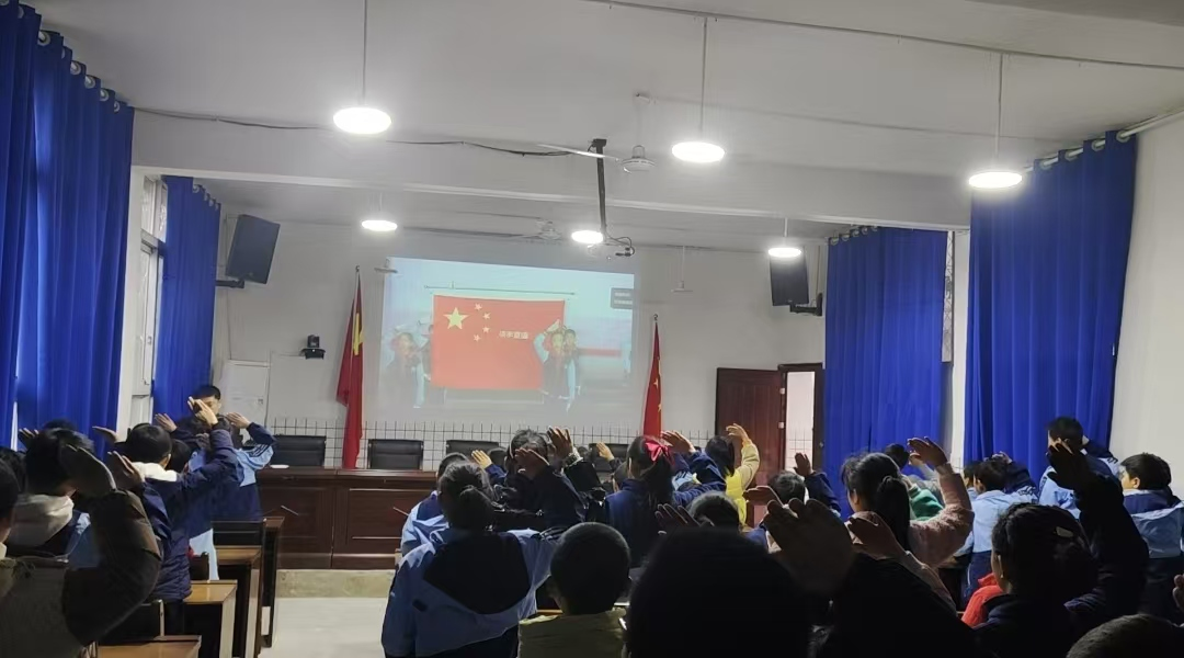 在庄严的国歌声中,学生们跟随网络直播,齐声诵读《中华人民共和国宪法》部分条款,全体学生精神饱满,情绪激昂,用心体会宪法的庄严与神圣。