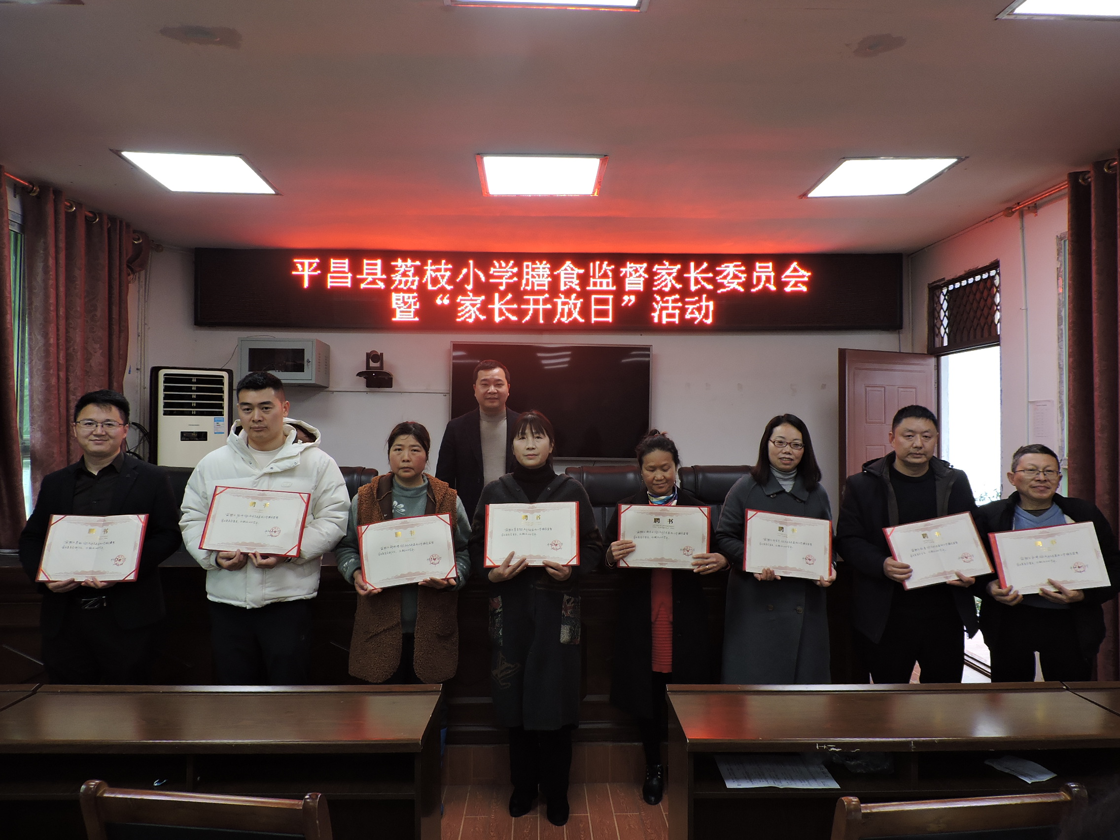 学校党支部书记、校长向与会家长介绍了学校“校园餐”实施的具体情况,表达了希望全体家长共同参与“校园餐”安全监督管理的愿望,宣布成立“平昌县荔枝小学膳食监督家长委员会”,并为各位委员颁发了聘书。