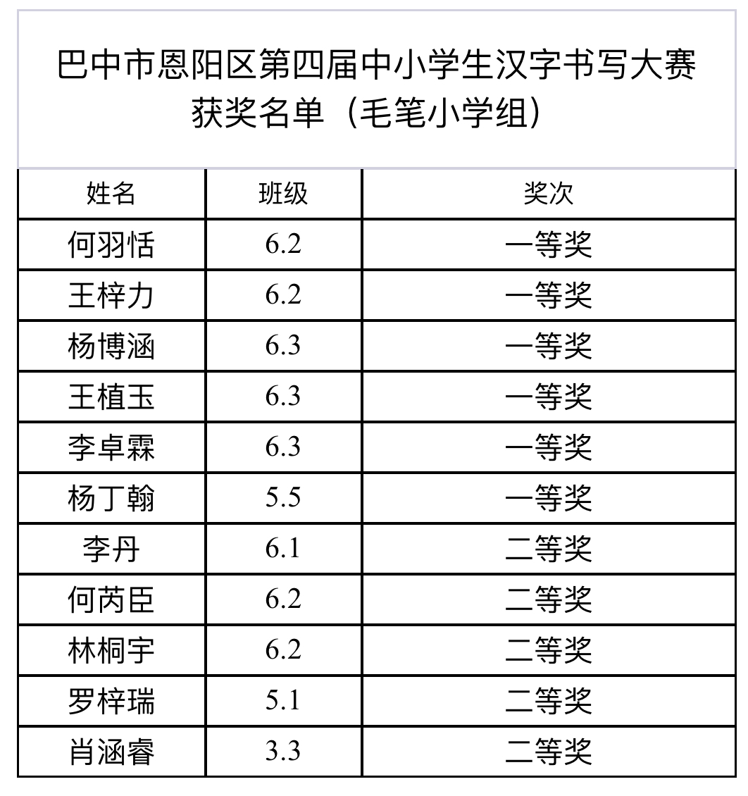 为弘扬中华优秀传统文化,提升学生汉字书写能力,我校积极组织优秀学子参加巴中市恩阳区第四届中小学生汉字书写大赛。经过激烈角逐,我校参赛选手凭借扎实功底和出色表现,在全区众多选手中脱颖而出,斩获多项大奖!