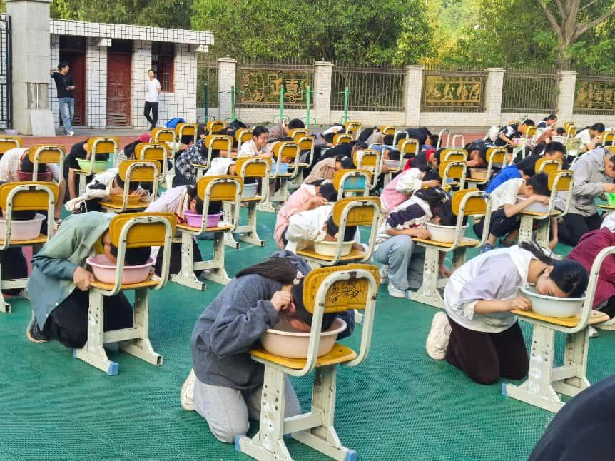 演练现场,安保主任向学生们讲解了发生溺水时正确呼救的方法、简单的救护措施,同时组织学生们利用水盆进行真实模拟溺水场景。随着一声令下,参加模拟的同学们屏住呼吸,将脸部浸入水盆中,“一、二、三……”时间一秒一秒地过去,同学们陆续把头抬起来。“我感觉快要窒息了”“鼻子好难受,呼吸不了”……这让学生们真切地感受到溺水的无力感及严重性。