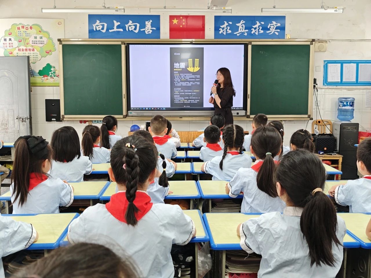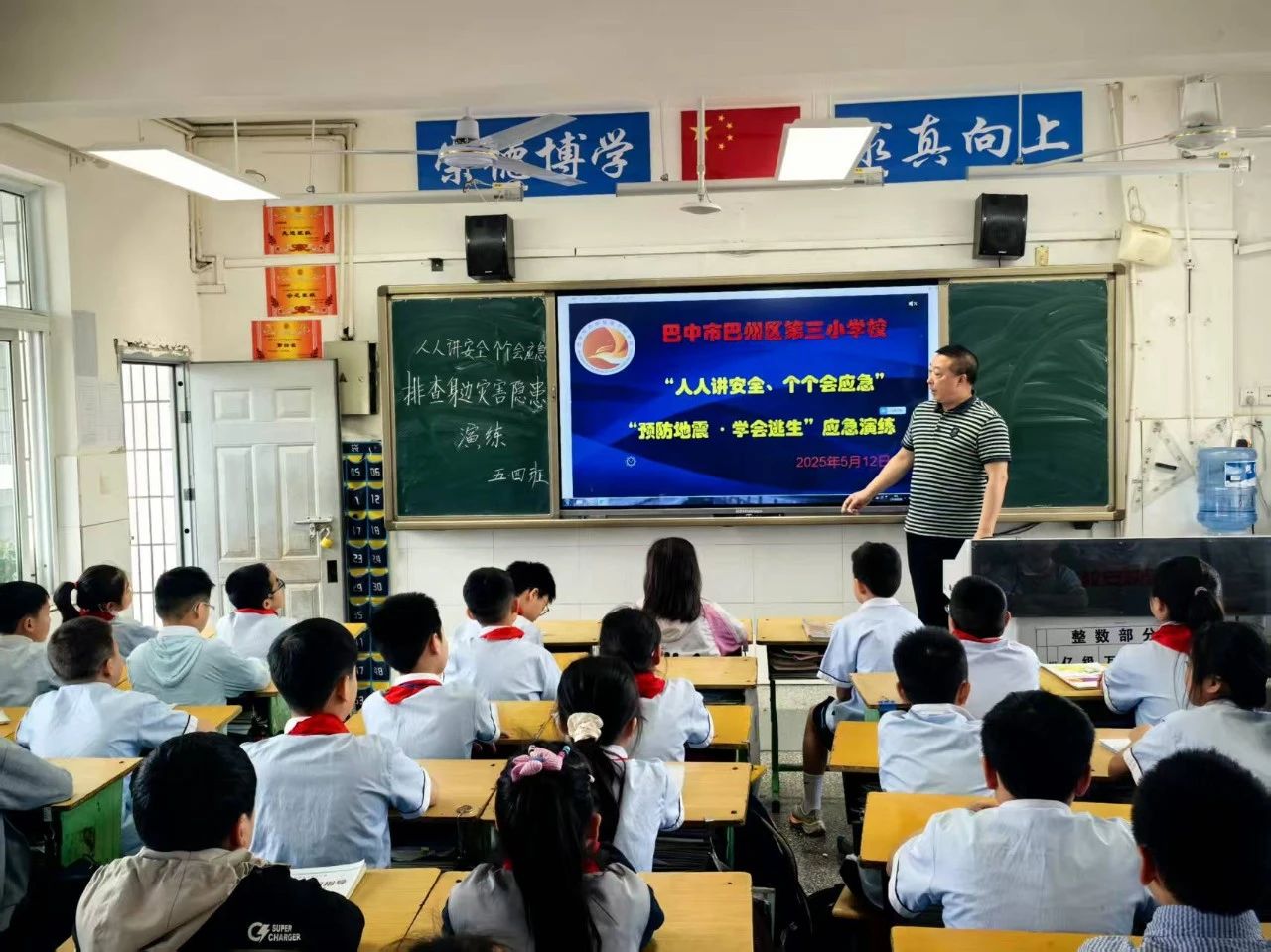 各班开展“人人讲安全,个个会应急”主题班会。班主任借助教育视频、灾害模拟动画,围绕“地震来了怎么办”展开讨论。通过情景模拟、逃生路线规划等形式,学生们进一步明确了疏散流程与避险细节。
