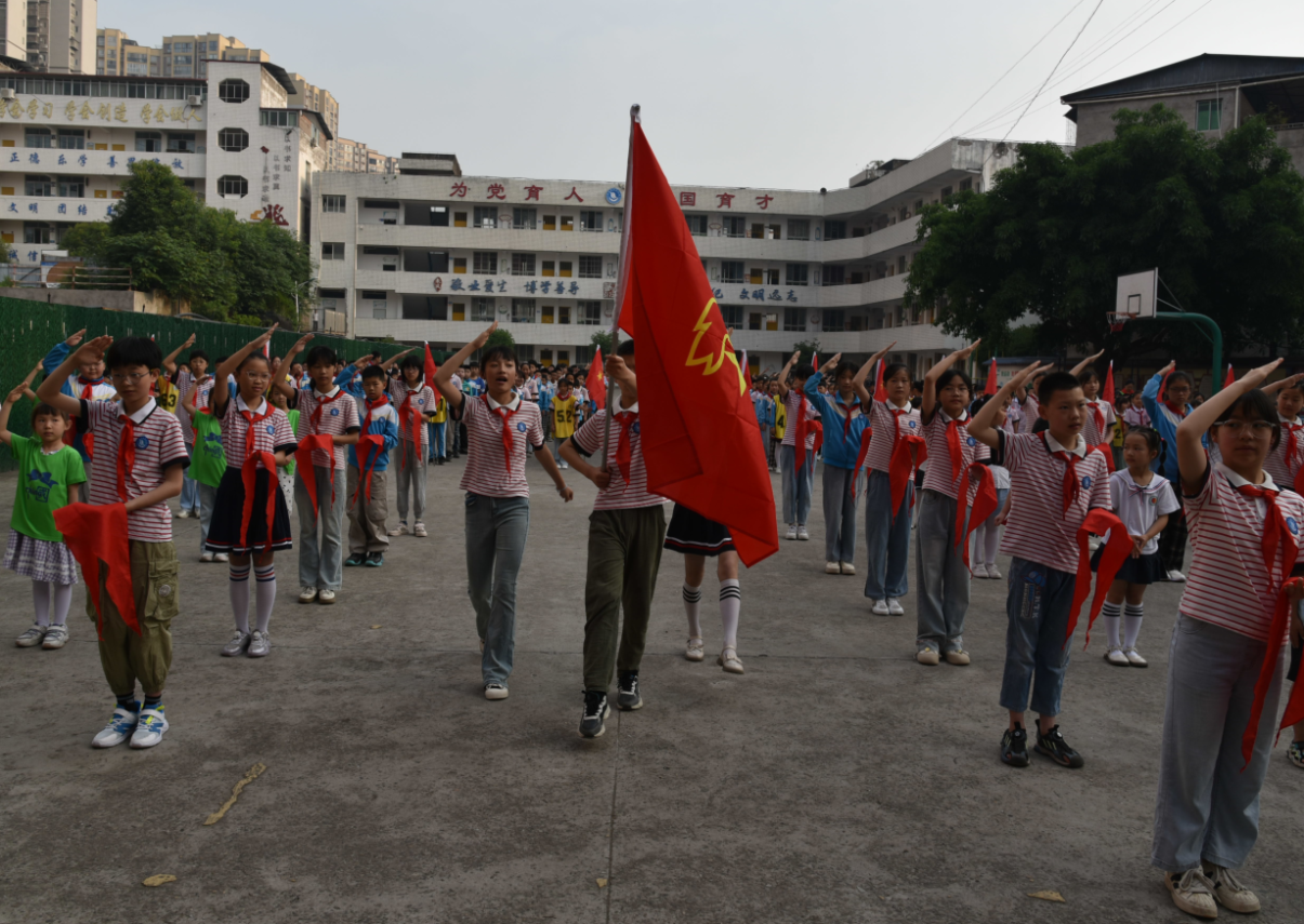 五年级优秀少先队员代表手捧红领巾,为新队员佩戴人生第一条红领巾。孩子们挺直脊背,目光灼灼,尽显喜悦与自豪。在大队长张晓芳的带领下,新队员面向队旗庄严宣誓:“我热爱中国共产党,热爱祖国,热爱人民……”誓言铿锵,字句如磐。