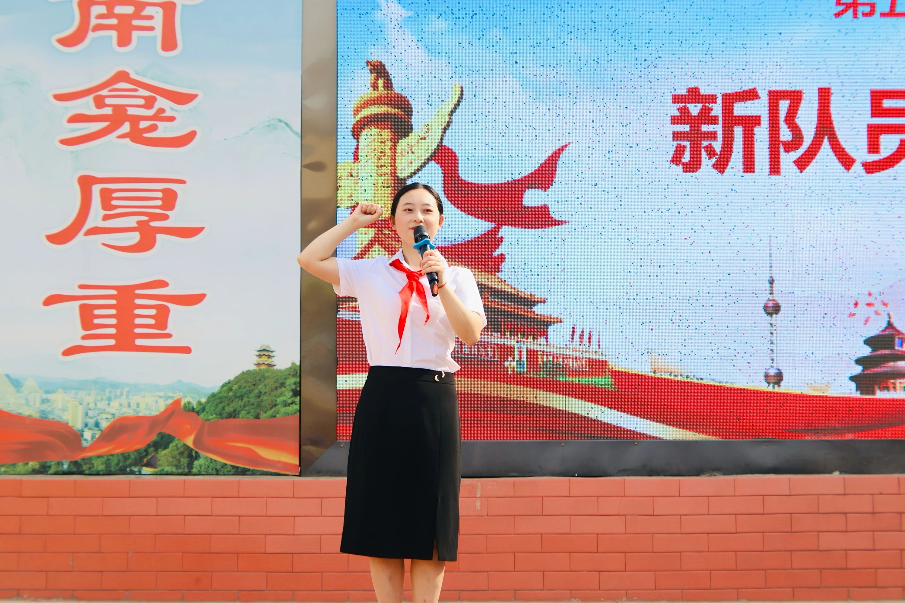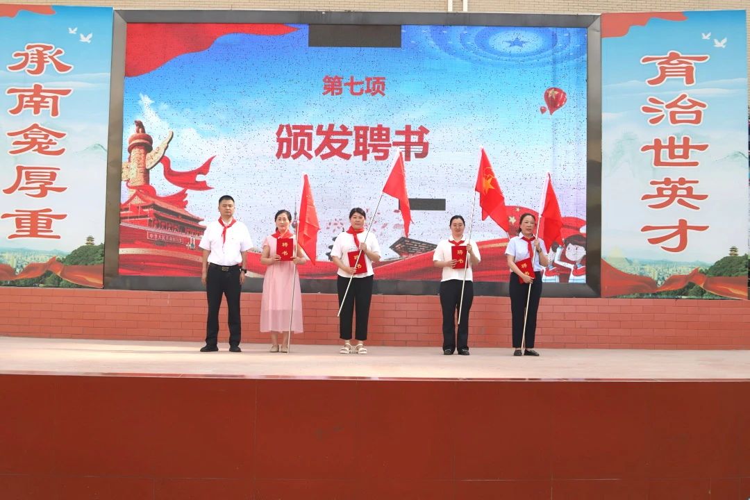 学校党总支副书记、校长鲜明同志为新建中队的中队辅导员颁发聘书。中队旗猎猎展开,辅导员接过聘书。一面旗,是一份责任;一本书,是一程守护。从此,他们将成为孩子们成长路上的“引路人”,共筑红色基因的传承之路。