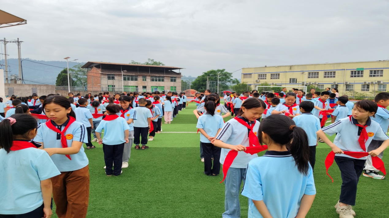 仪式在激昂的出旗曲中拉开帷幕,旗手们迈着整齐有力的步伐护送队旗入场,全体少先队员行队礼,高唱《中国少年先锋队队歌》,嘹亮的歌声饱含着对少先队组织的无限向往。在热烈的掌声中,老队员们郑重地为新队员佩戴红领巾,他们双手托着红领巾,细致地为新队员系上,每一个动作都充满了关爱与期待。新队员们抚摸着胸前鲜艳的红领巾,脸上洋溢着自豪与喜悦,这一刻,红色基因在两代队员间完成了神圣的传承。