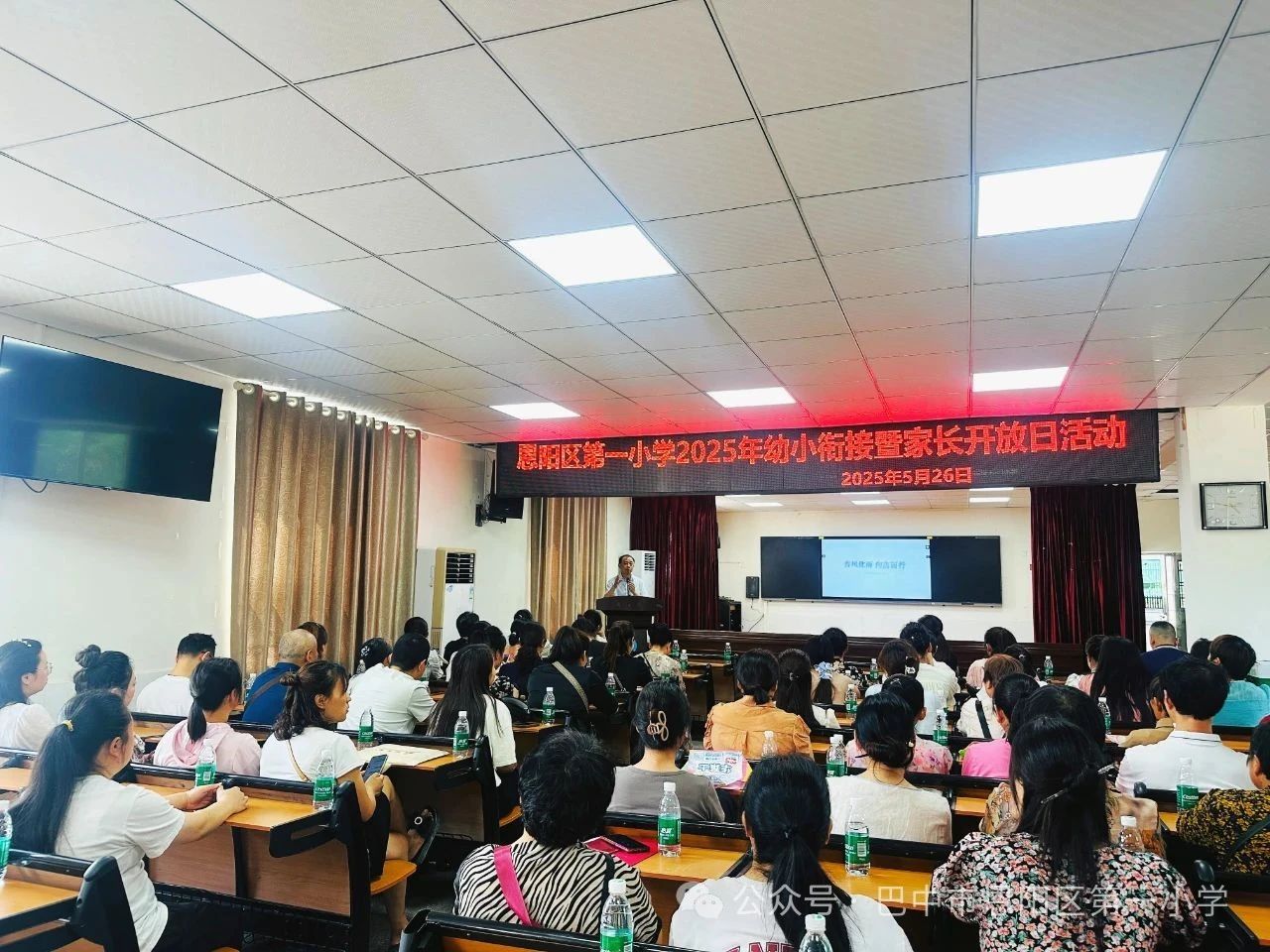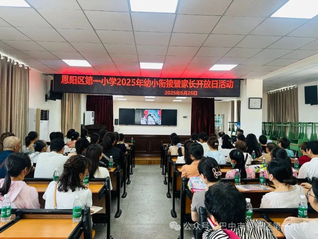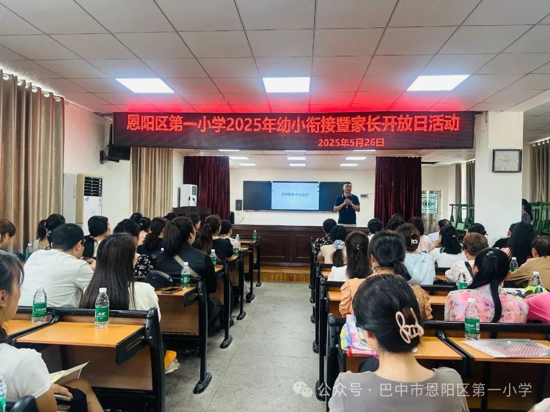 2025年5月26日上午9:00,阳光明媚,恩阳一小附属幼儿园大班的家长们齐聚校园,参加2025年春幼小衔接暨家长开放日活动。这不仅是家长与老师的相聚,更是为孩子们即将开启的小学生活奠基,让家长们深入了解学校教育理念与校园文化的盛会。