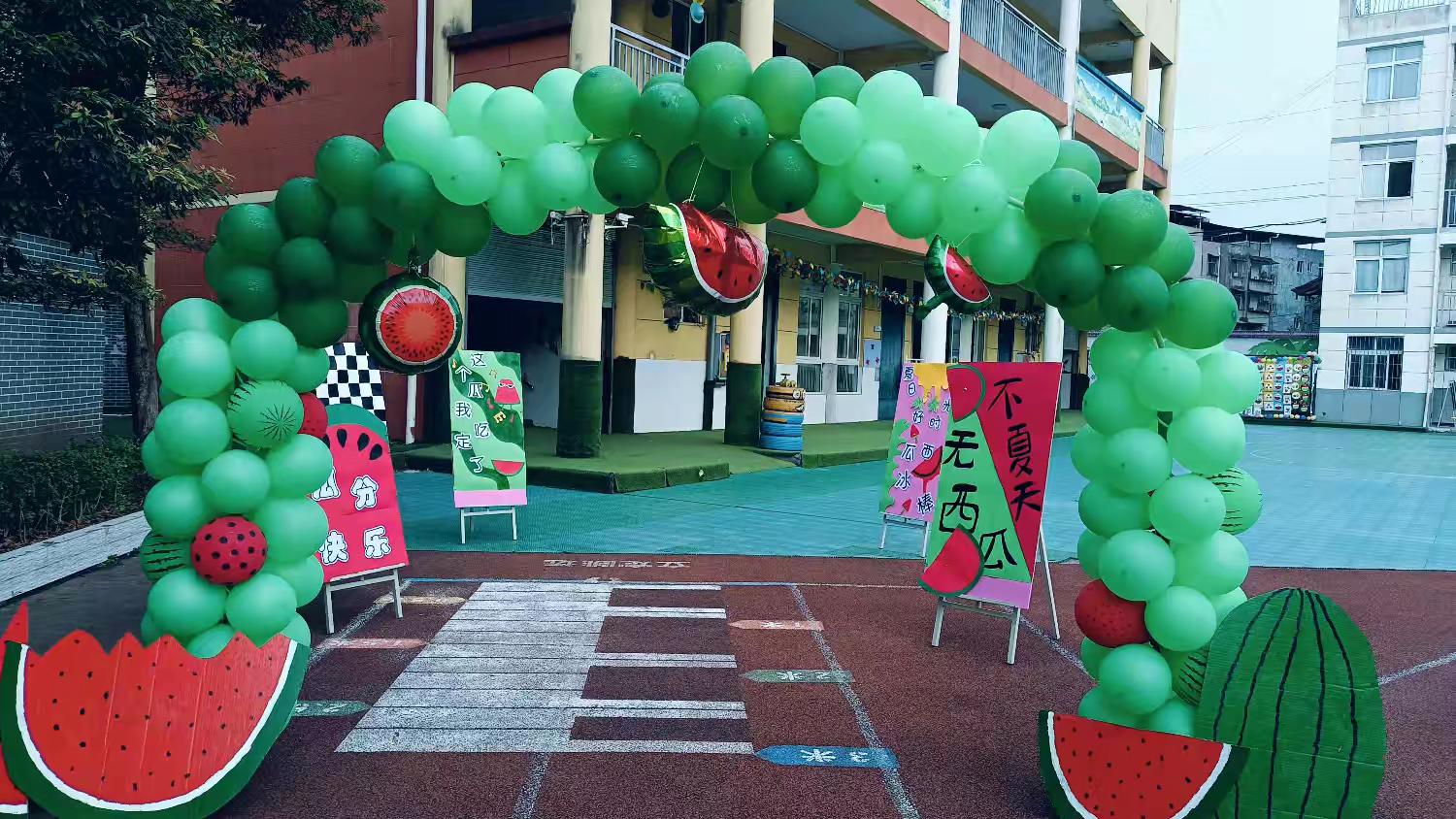 幼儿园的活动场地被精心布置成了"西瓜乐园":绿色藤蔓装饰缠绕在围栏上,红色西瓜造型的气球点缀其间,空气中早早飘来了清甜的西瓜香。老师们提前切好了大小适中的西瓜块,还准备了西瓜汁、西瓜串串等趣味道具,只等家长和孩子们的到来。