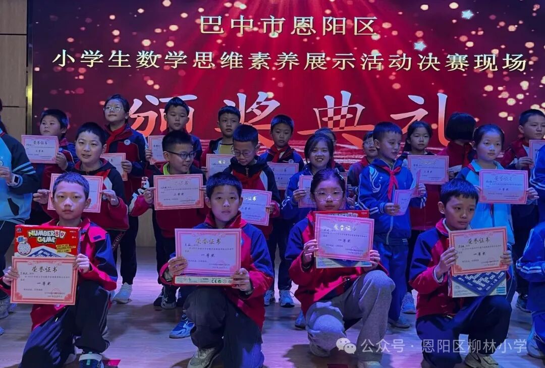2025年10月30日,恩阳区第一届小学生思维素养比赛圆满落幕,本次比赛共10所学校,200名数学小达人同台竞技。柳林小学20名学生参加竞赛,17名学生获奖,其中一等奖6人、二等奖6人、三等奖5人,团队成绩位居前列,充分展现了我校学子卓越的思维素养与综合能力。