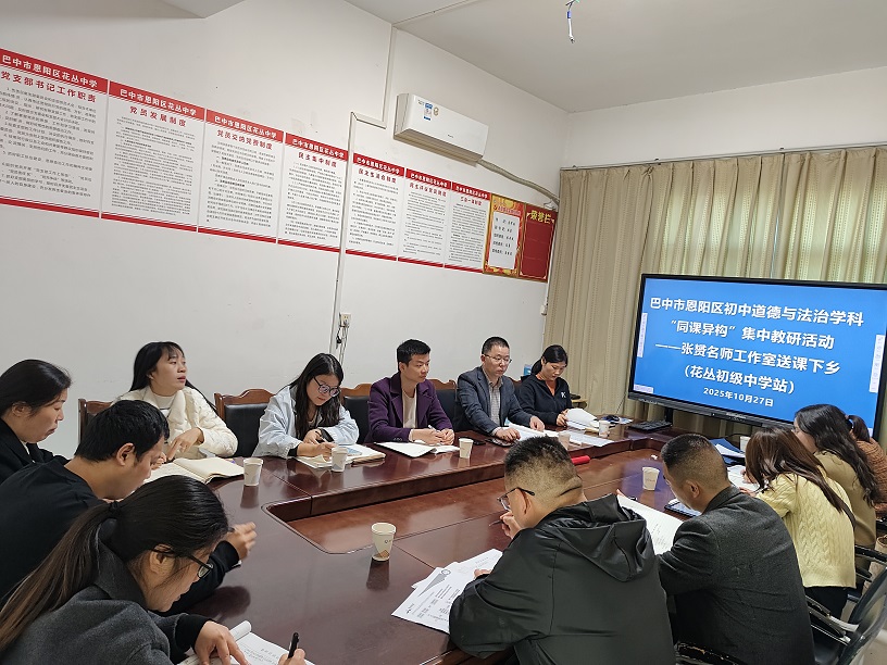 为深化课堂教学研究,充分发挥名师的示范、引领与辐射作用,2025年10月27日,巴中市恩阳区张赟名师工作室在花丛初级中学成功举办了“同课异构”暨“送课下乡”集中教学研讨活动。本次活动聚焦初中道德与法治九年级上册《延续文化血脉》一课,为全区同学科教师搭建了一个高质量的交流平台。