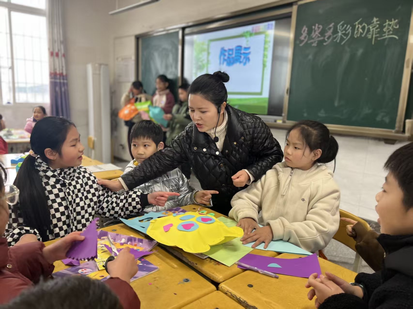 张晓玲老师执教的《多姿多彩的靠垫》一课,将美学理论与生活实践紧密结合。课程从观察靠垫图案入手,引导学生认知轴对称与中心对称的数学美感,奠定设计基础。随后通过视频观摩与现场制作,帮助学生将理论知识转化为动手实践。最后以小组展示和多元奖项评选(如最佳色彩奖、创意奖等)完成教学闭环,有效提升了学生的美学素养、创作能力与综合表达能力,实现了从认知到创造的完整学习过程。