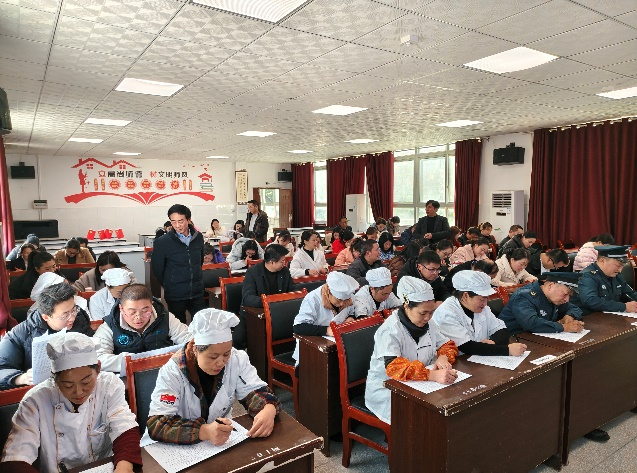 在师德师风答题测试环节,活动采用闭卷形式,并由工会设立3名监考人员进行监考,试题涵盖《新时代中小学教师职业行为十项准则》、教育法律法规、师德师风核心要求等内容,同时结合食堂工人、保安等临聘岗位特点,融入服务规范、安全职责等针对性考点,全面考察全体人员对师德师风知识的掌握程度。测试过程中,全体参与者严格遵守考场纪律,专心审题、细致作答,展现出良好的职业素养与学习态度,达到了“以考促学、以学促行”的活动目的。