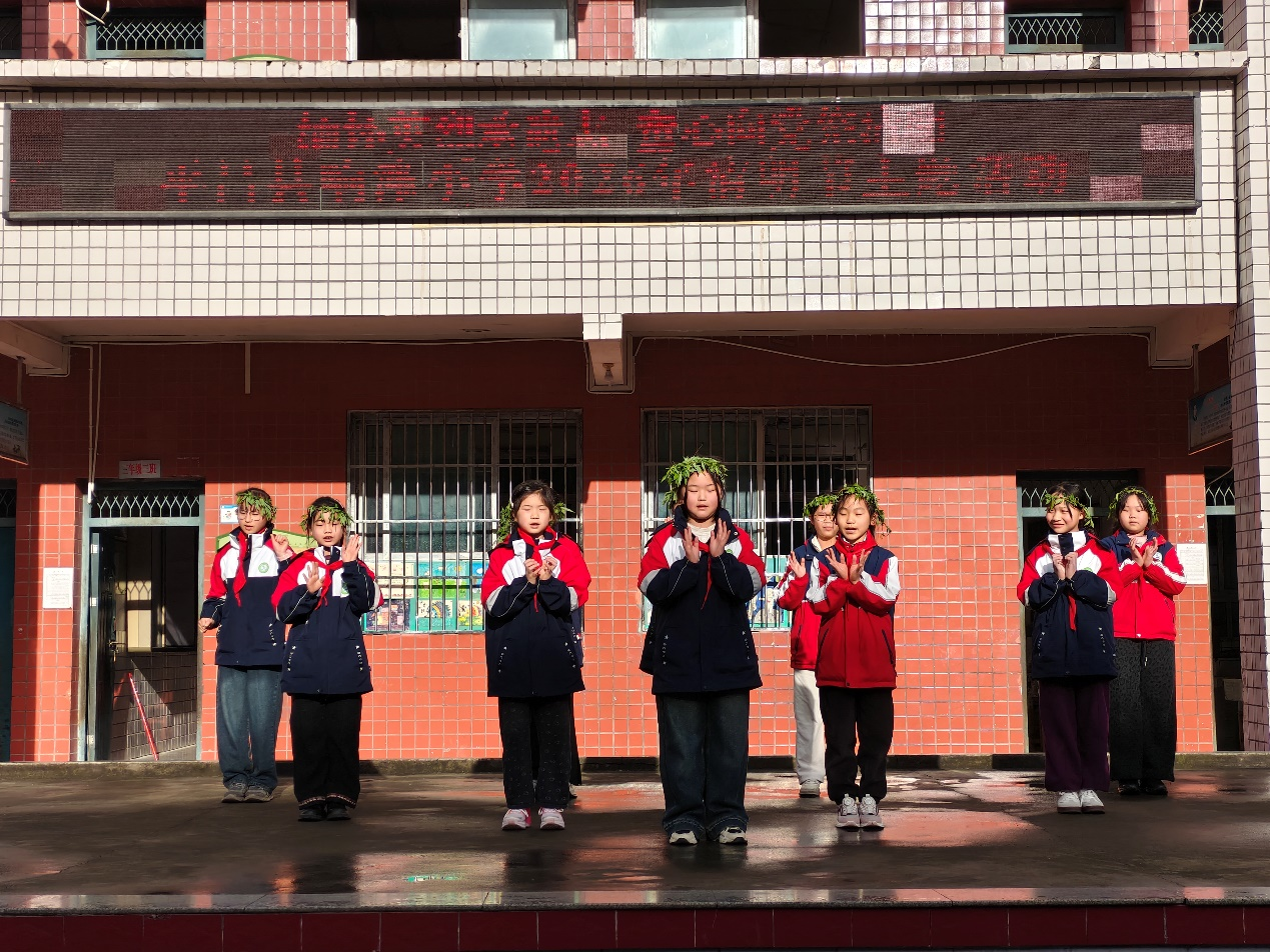 活动在稚嫩又深情的清明童谣手势舞中正式拉开帷幕。孩子们身着整齐校服,跟着节奏轻舞双手,用清脆的童声吟唱清明童谣,将传统节日习俗与对革命先烈的缅怀之情完美融合,灵动的表演饱含童真敬意,为整场活动营造出庄重而温暖的氛围。